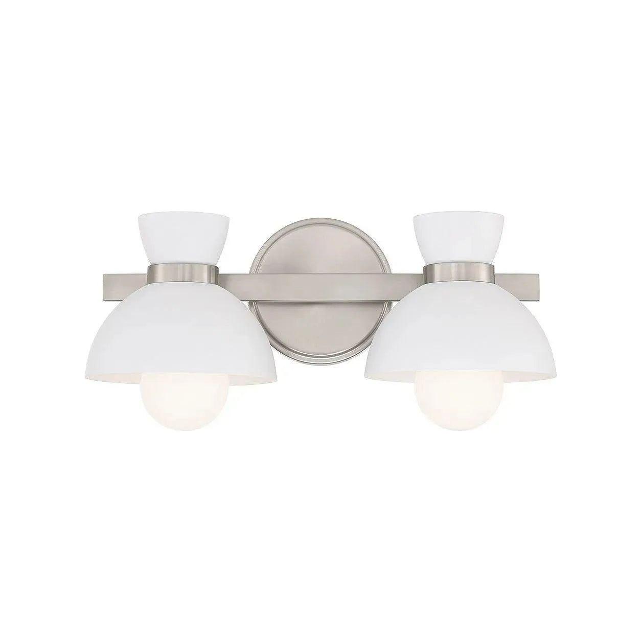 Brushed metal hardware and crisp white glass shades create a layered, architectural silhouette that casts even, glare-free illumination — ideal for vanities, mirrors, and hospitality washrooms. The compact backplate and horizontal bar offer a low-profile presence while the dual-lamp arrangement ensures balanced task lighting.