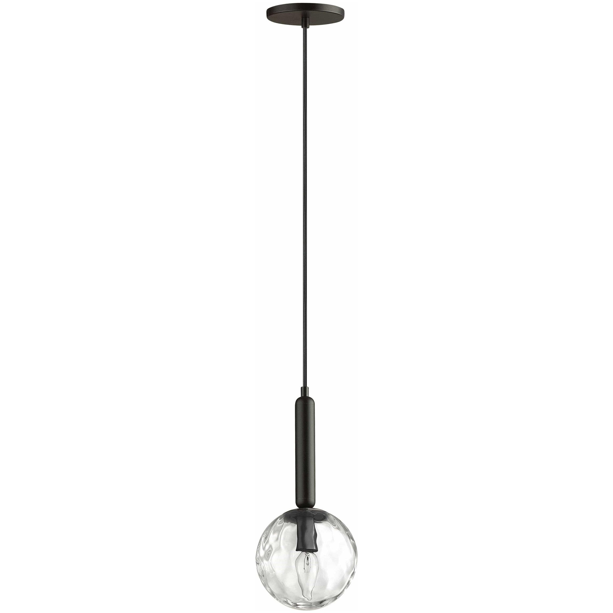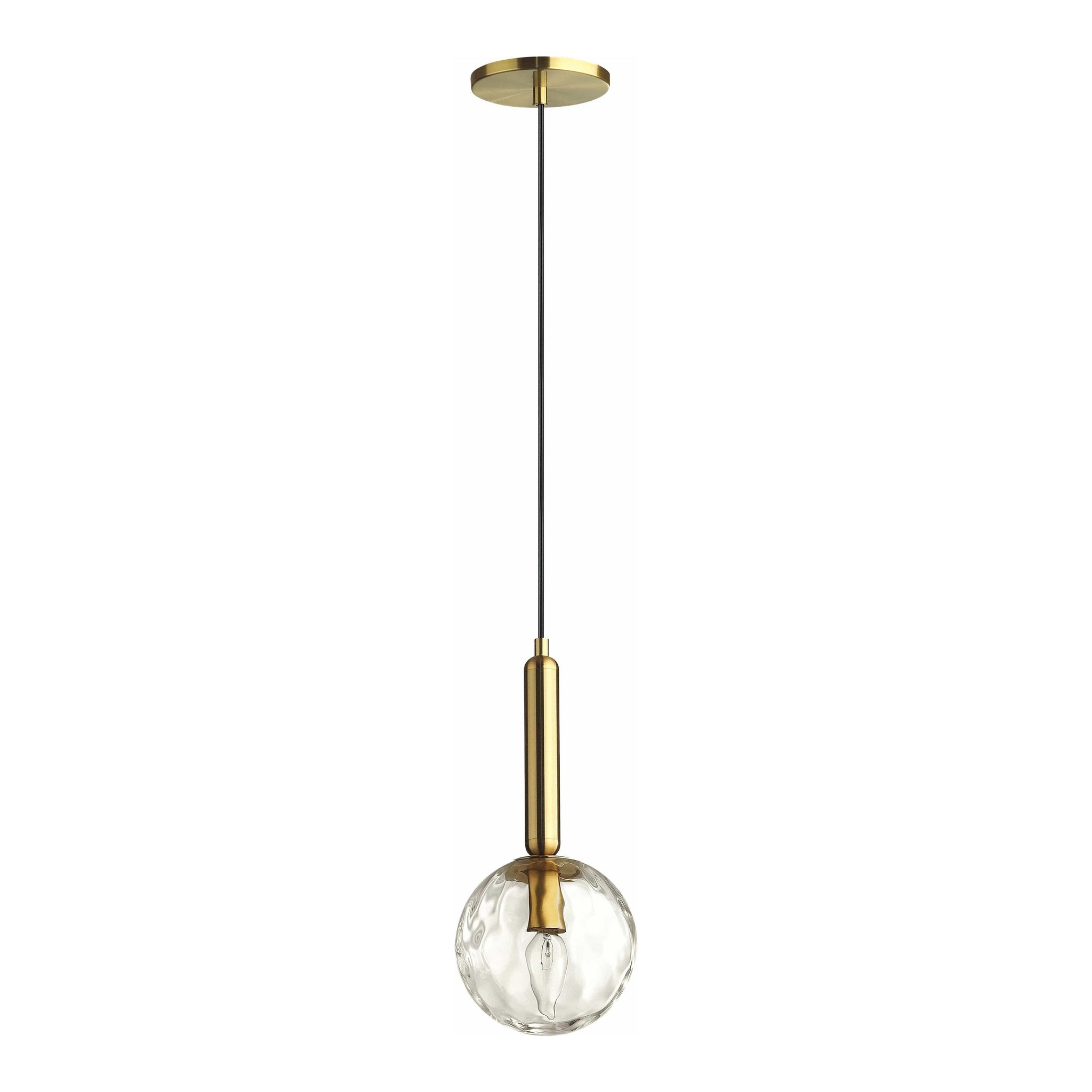 Hand-finished metalwork in a warm brass tone anchors a clear, subtly textured glass globe that reveals the bulb — a study in refined contrast and material honesty. The slender suspension rod and minimal canopy create a clean profile suitable for kitchens, bars, and layered living spaces.