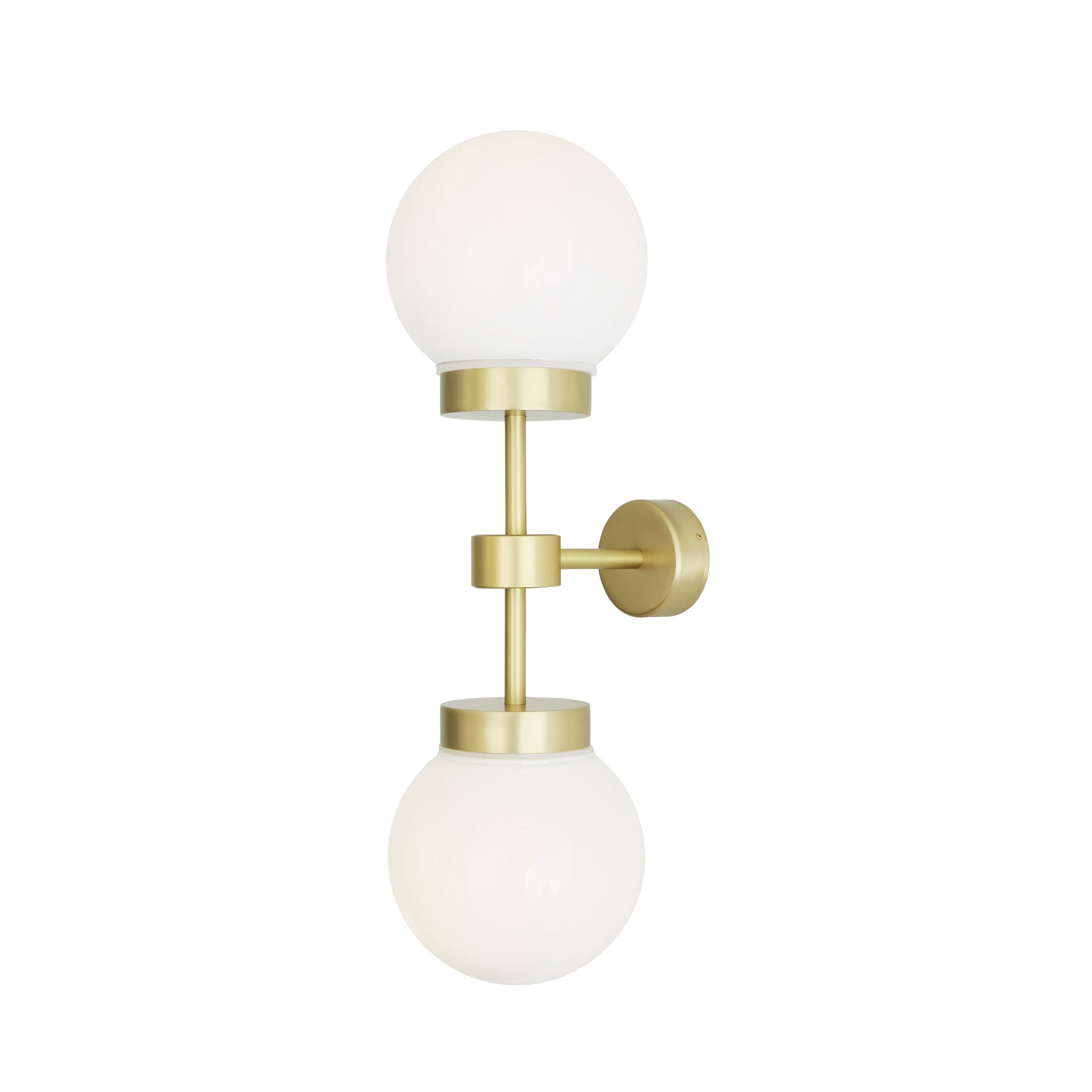 Grange Double Wall Light from Mullan Lighting pairs minimalist geometry with refined finishes to deliver a sculptural, functional fixture for elevated interiors. Two clear glass globes float on a slim, satin-brass rod, creating balanced ambient light and a strong vertical silhouette that reads equally well in corridors, bathrooms, or over bedside consoles.