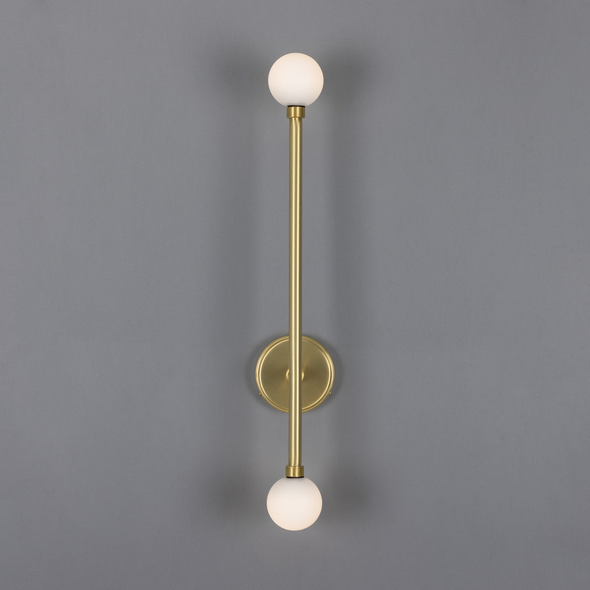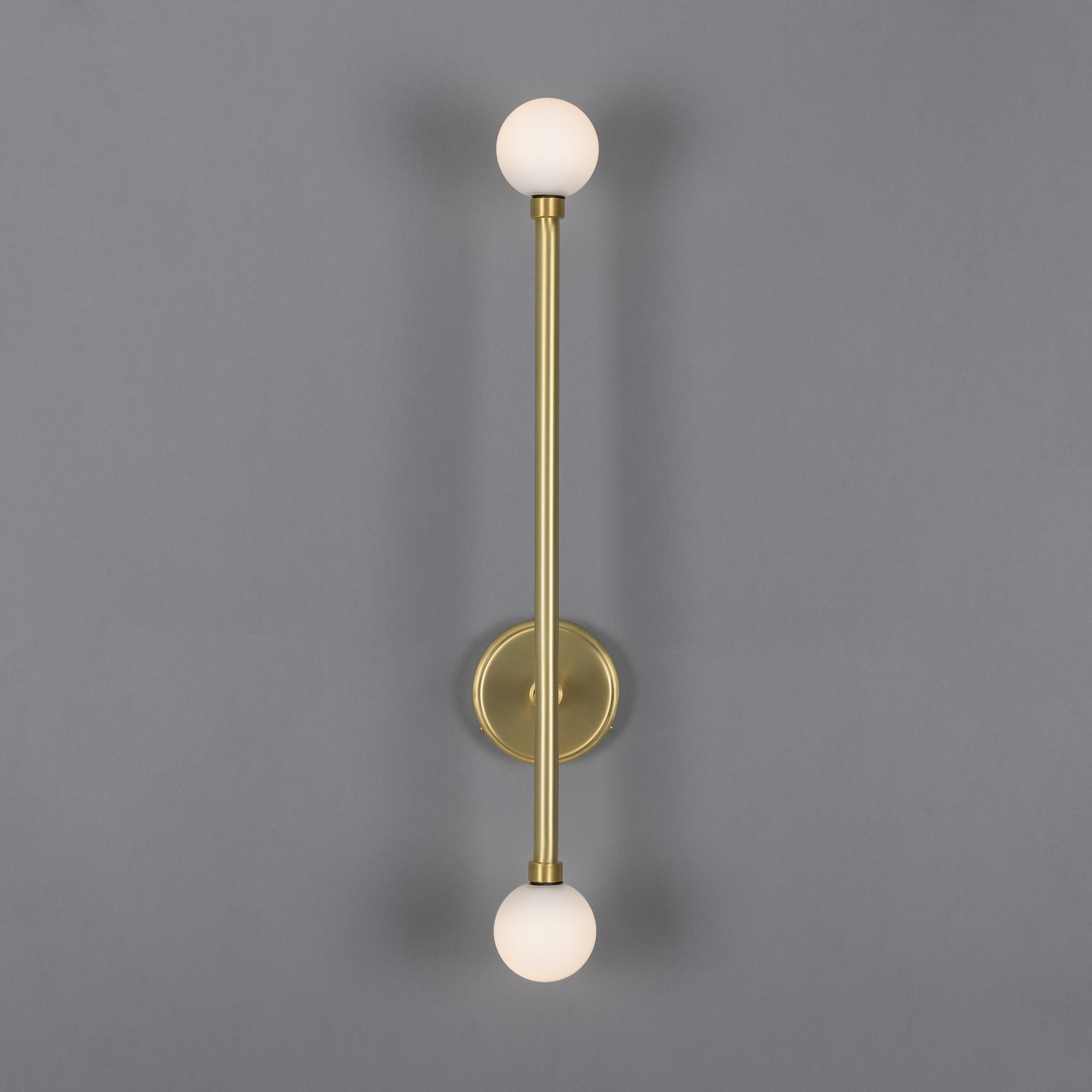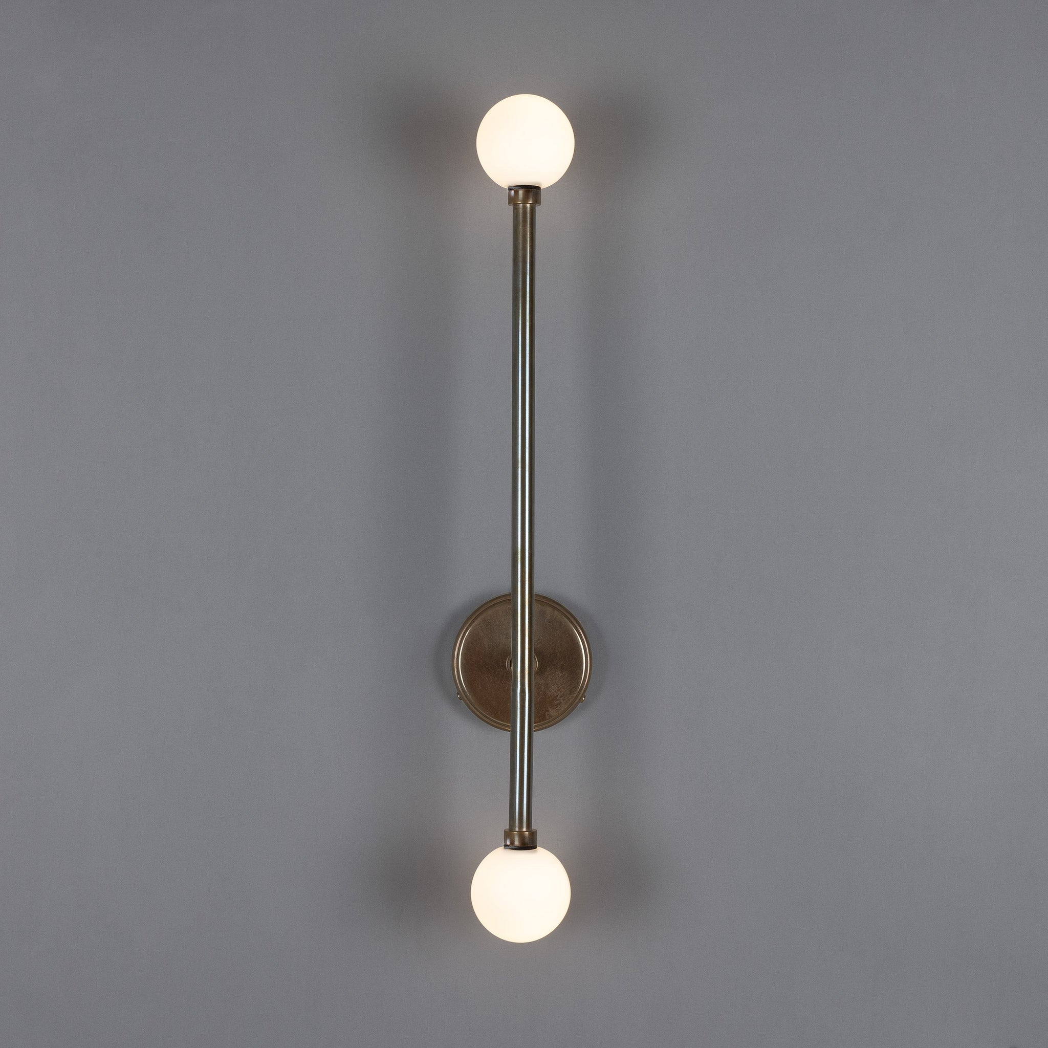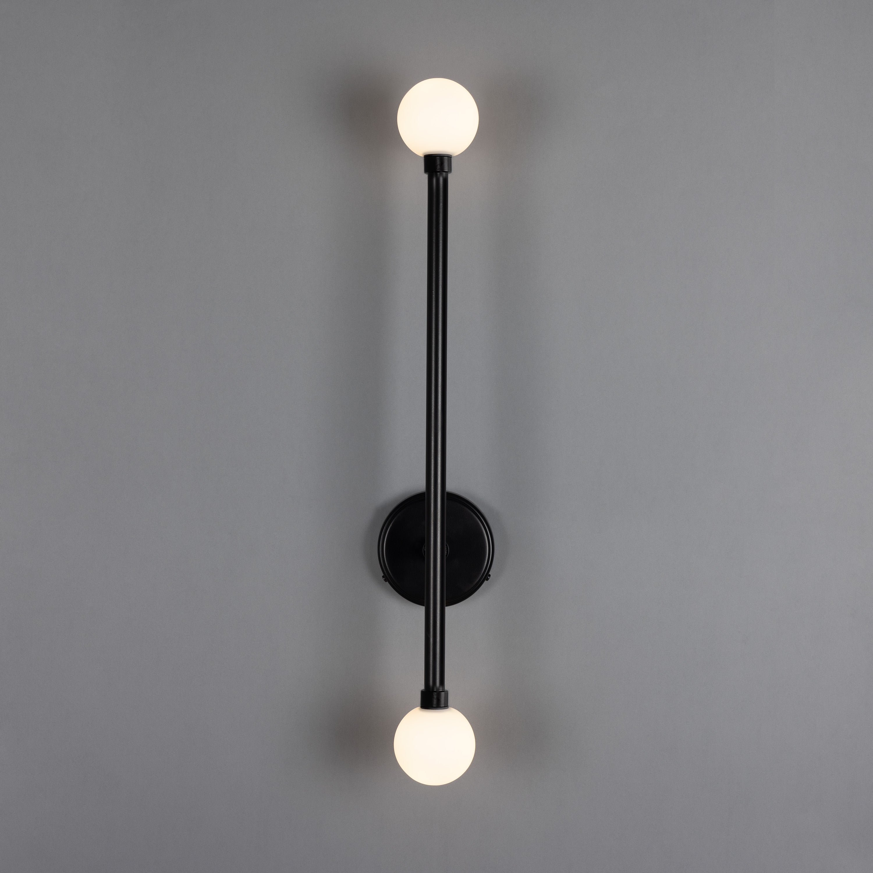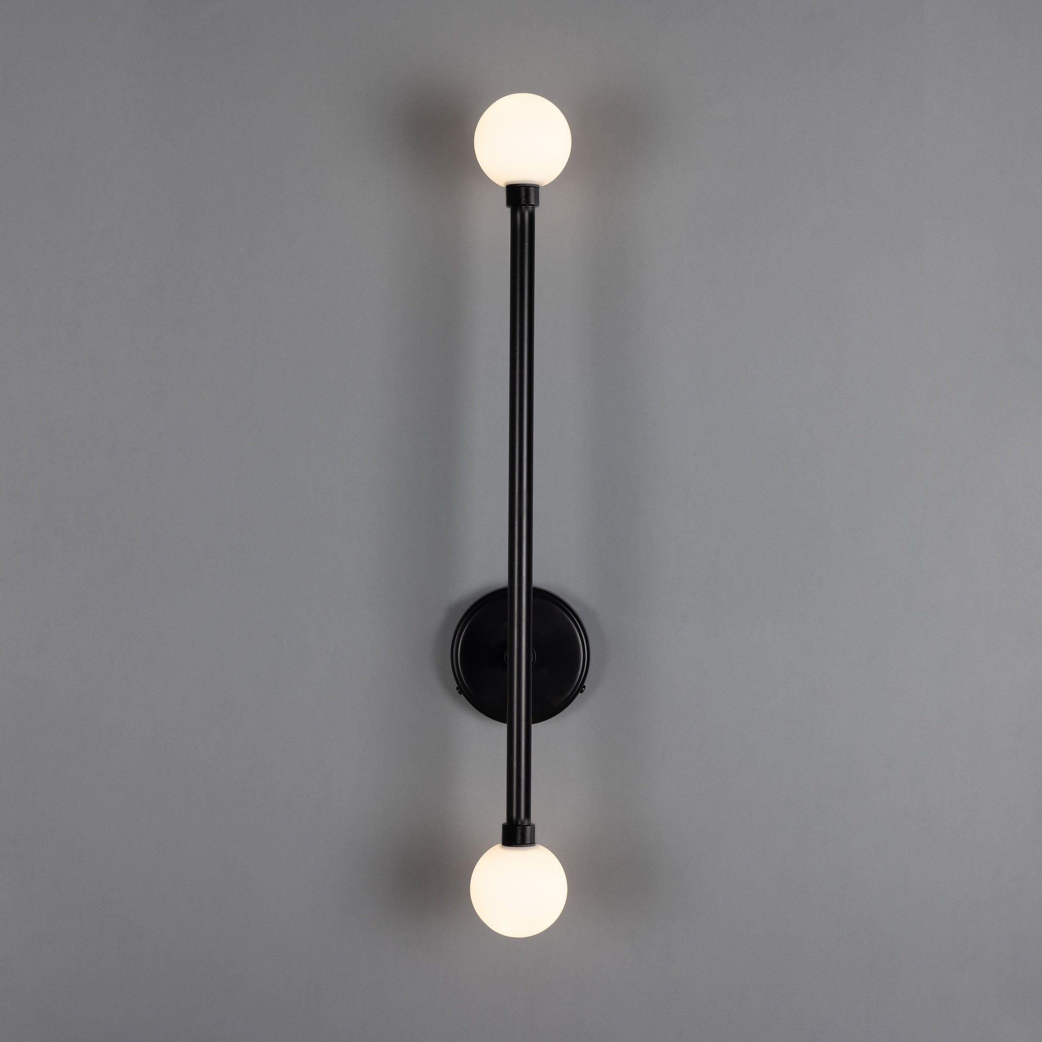 Gunning Wall Light by Mullan Lighting is a refined study in vertical balance: a slim metal rod anchored to a round backplate holds two opal glass globes that deliver soft, even illumination. The result is a sculptural, modern wall sconce that reads as both functional task light and architectural detail.