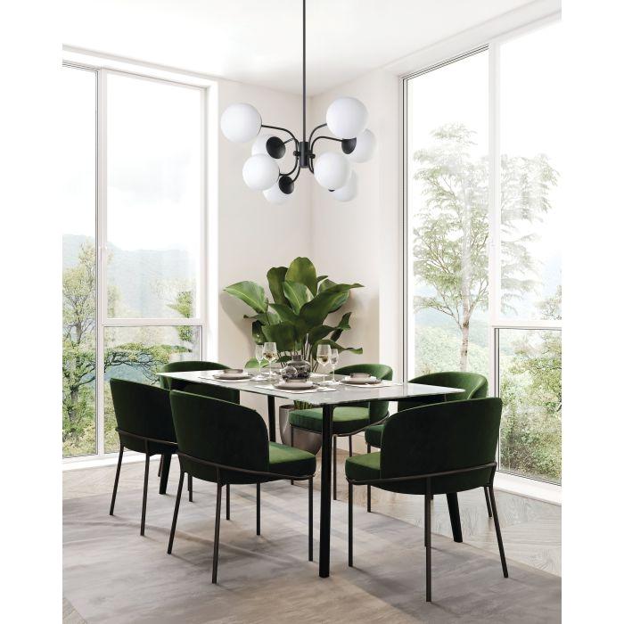 Moultrie Pendant by Eglo Lighting — a sculptural, modern chandelier that balances refined geometry with soft, ambient light. Its matte black metal frame and gracefully arcing stems present a considered silhouette; the frosted opal glass globes diffuse illumination evenly for an inviting, glare-free glow.