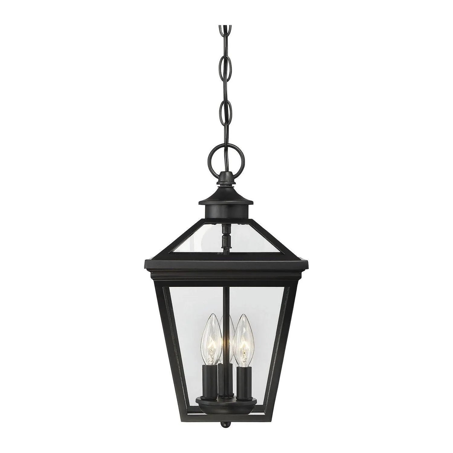 Brighten the exterior of your home and welcome your guests in style with the Savoy House Ellijay outdoor hanging lantern. The design mimics a vintage gas lantern with a classic tapered box shape and decorative top finial. The black finish looks terrific and blends well with other hardware and architectural materials. Panes of clear glass fill all four side panels and the roof panels, too. With the option of Three or Four 40W candelabra size bulbs provide inviting and secure illumination. You'll enjoy its timeless style and enhance the beauty of your property, whether on your porch, patio, sunroom, pergola or hung from other outdoor ceilings in your garden and yard.