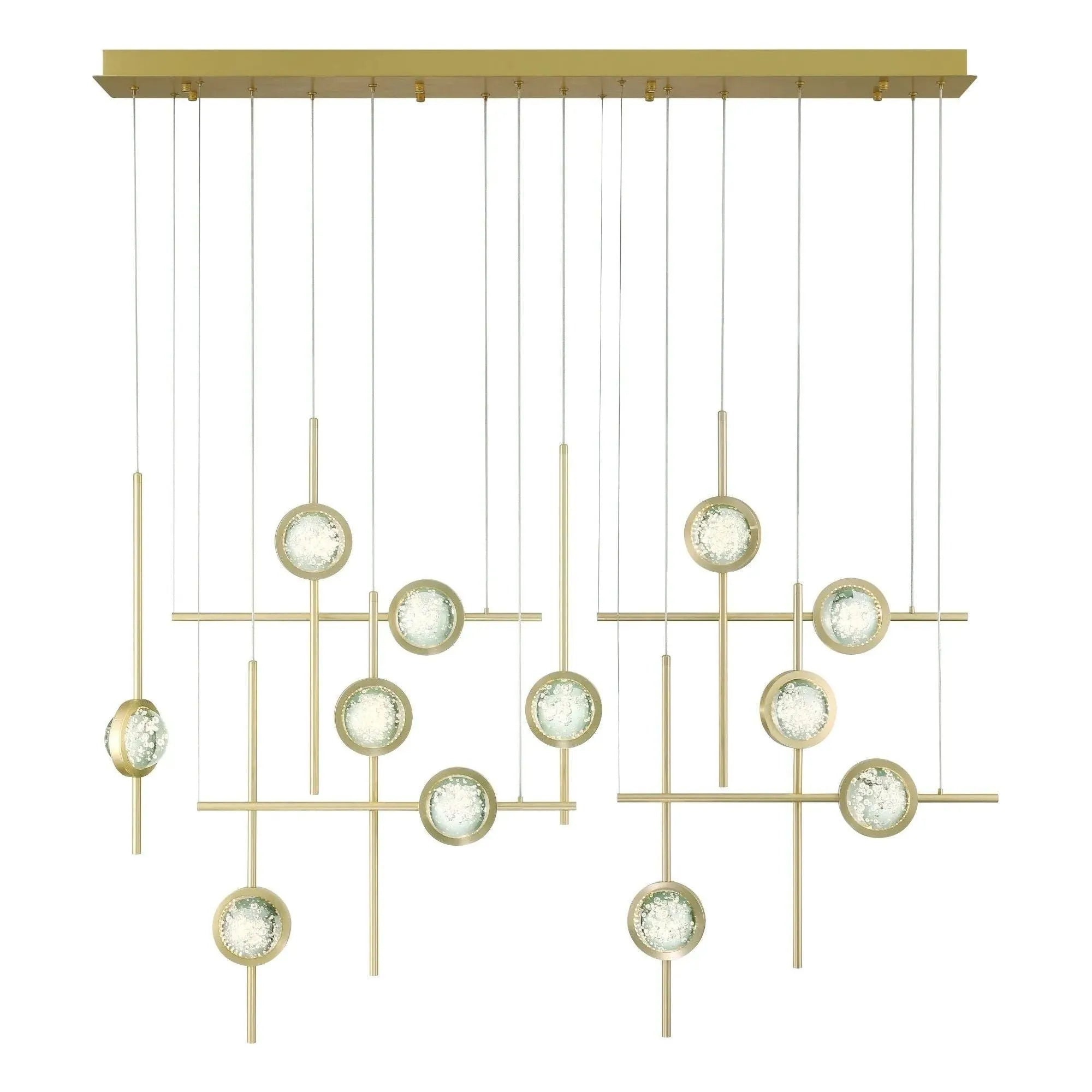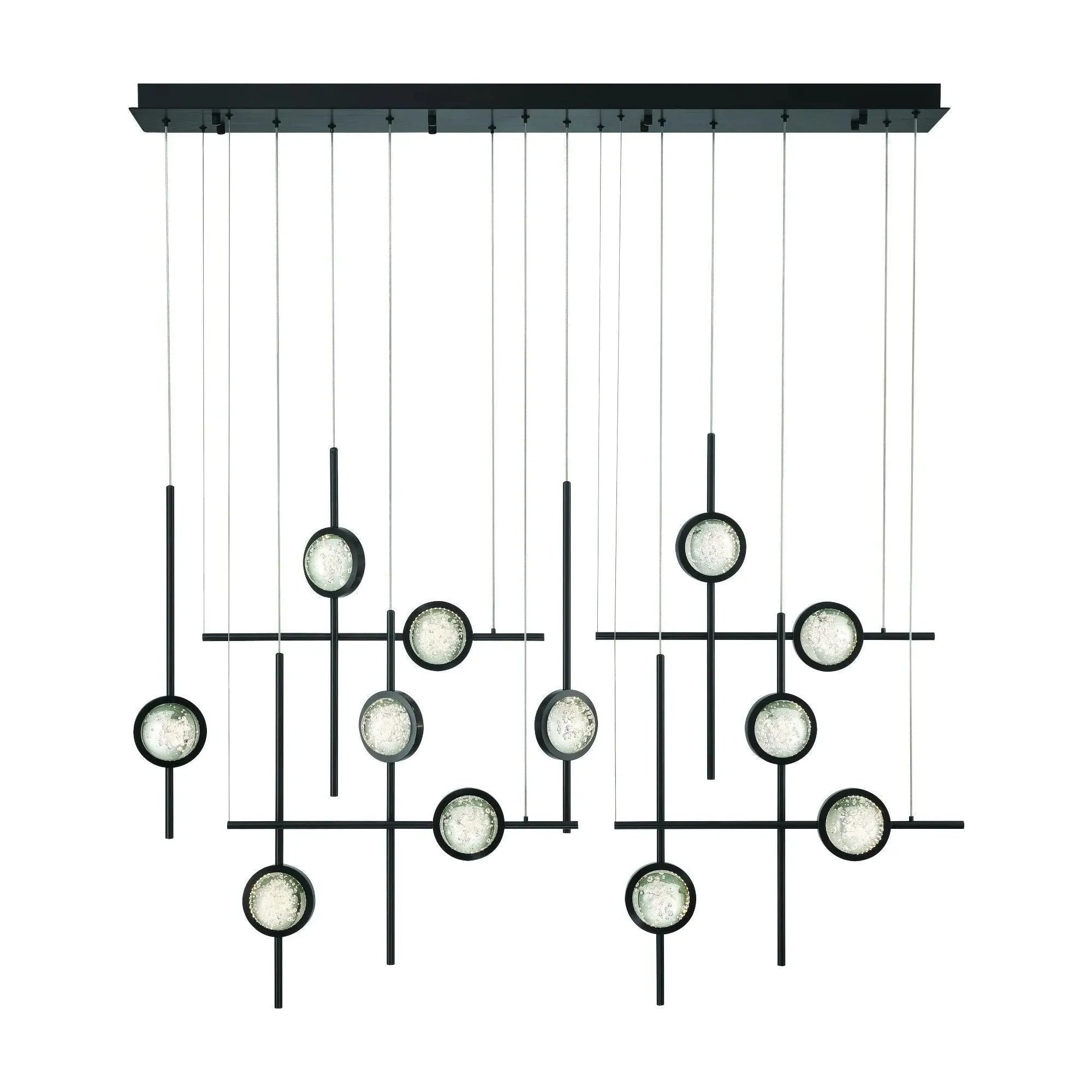 Eurofase presents the Barletta LED Linear Chandelier — a sculptural statement that balances minimalist geometry with tactile detail. Vertical anodized rods suspend at varied heights from a slim rectangular canopy, each rod punctuated by a clear seeded glass orb cradled in an anodized ring to deliver refined, jewel‑like illumination.