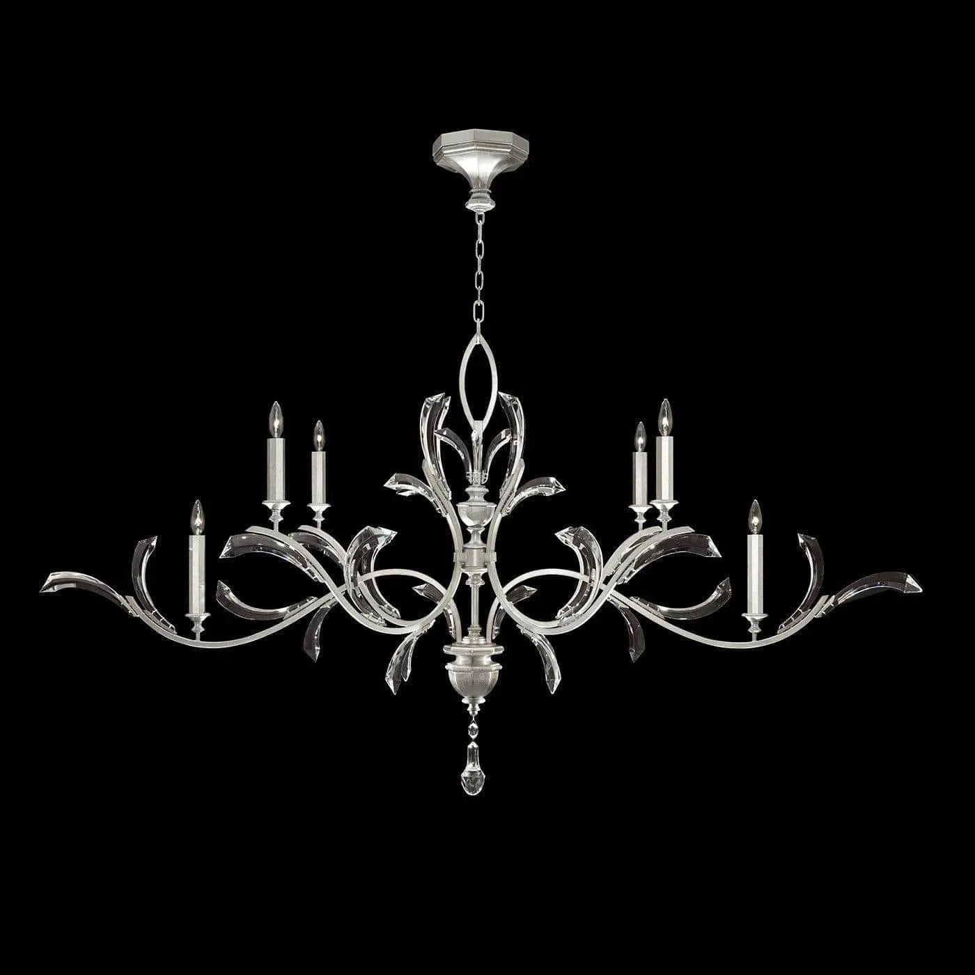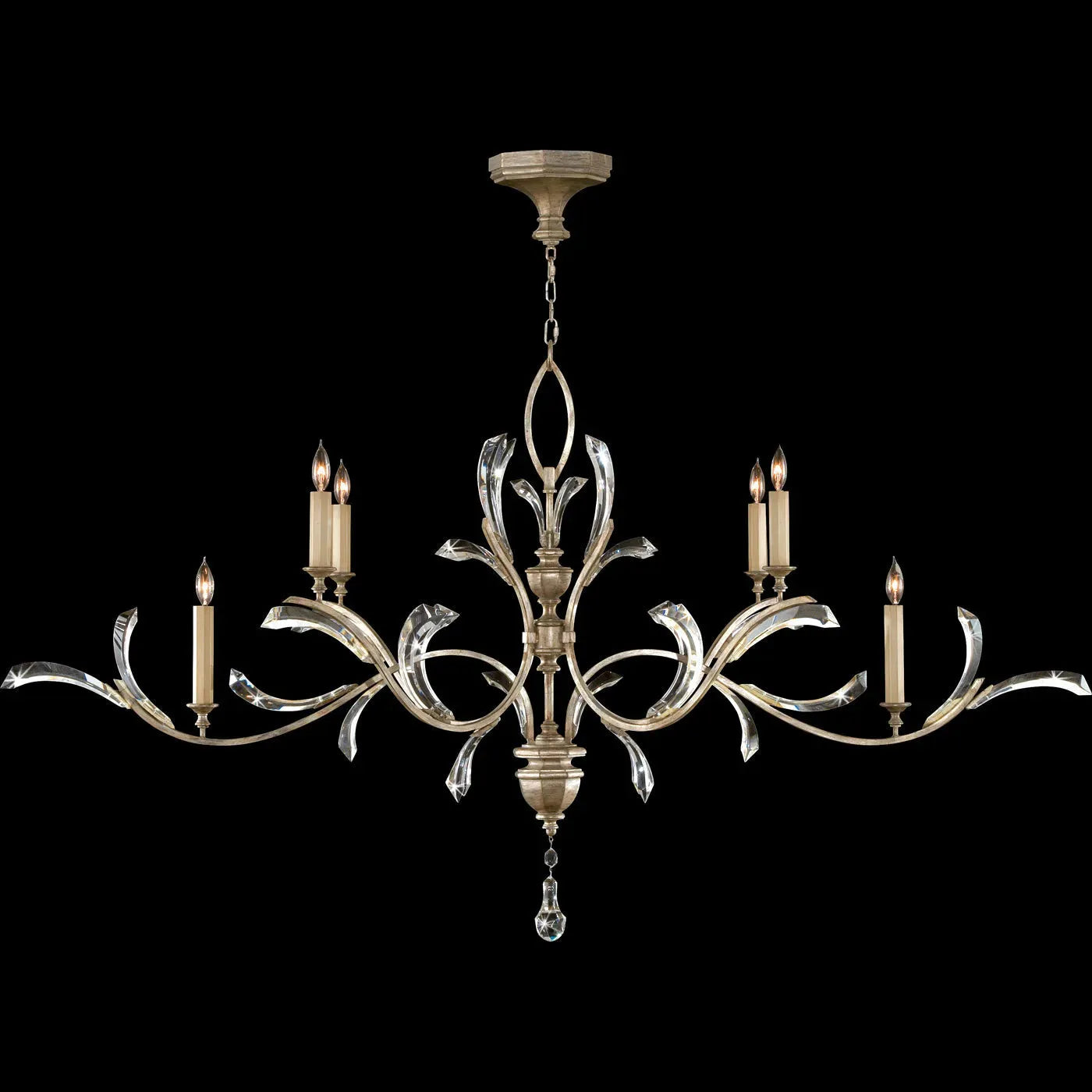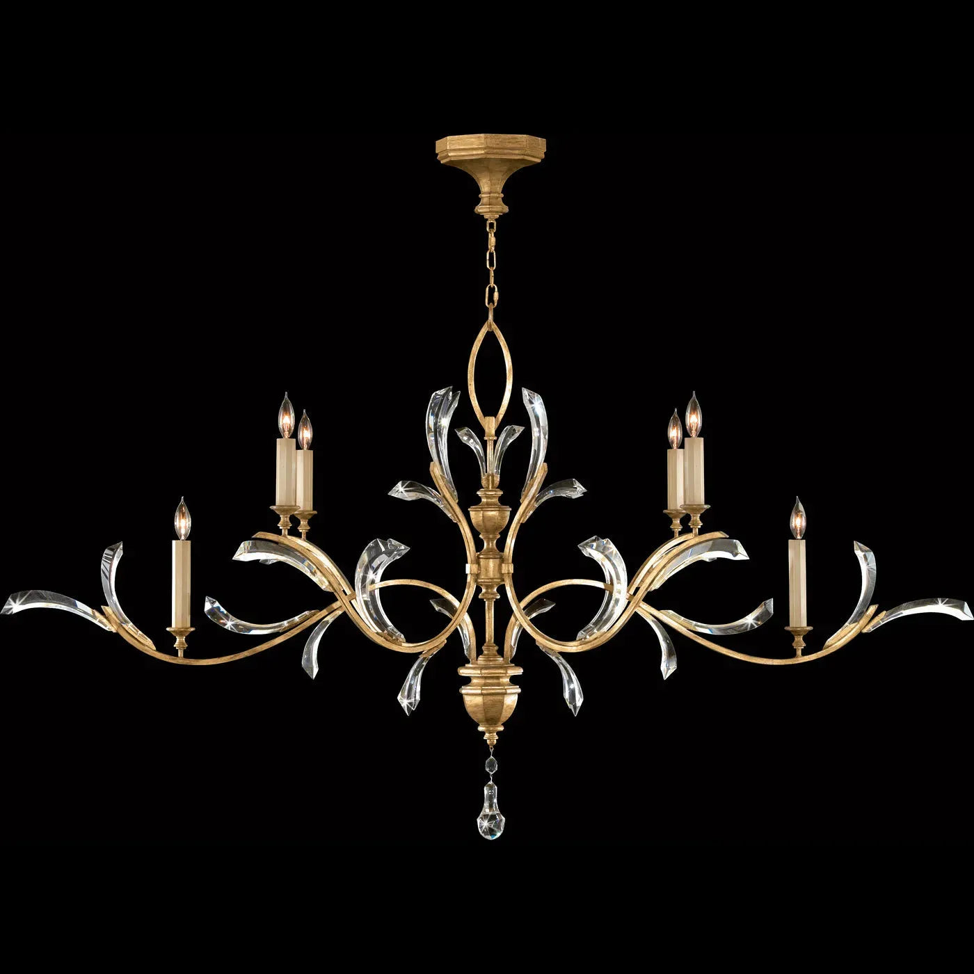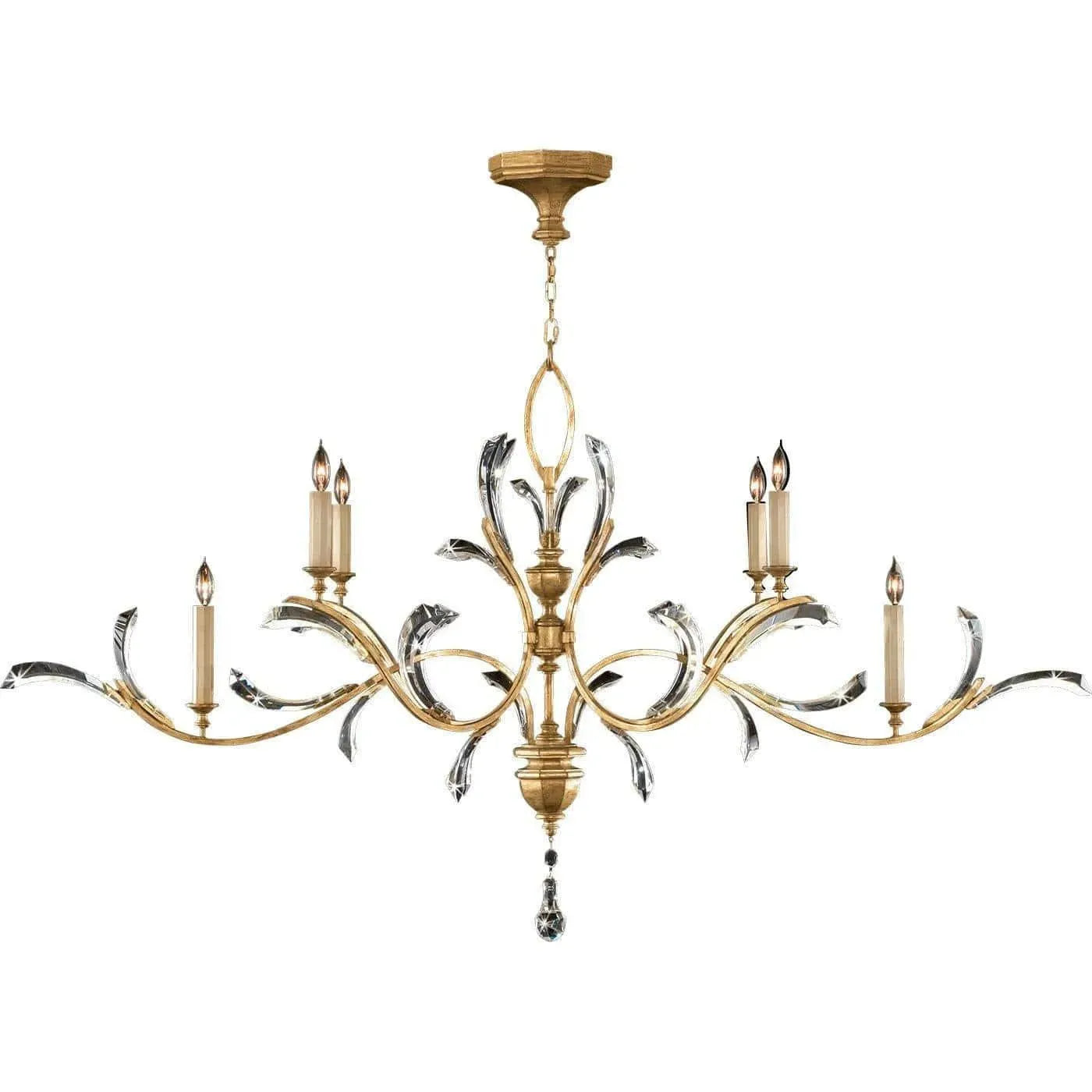 Beveled Arcs 74-Inch Six Light Chandelier — a sculptural statement from Fine Art Handcrafted Lighting that pairs classical candelabra form with modern, beveled glass detailing. Designed to read as both architectural and delicate, its sweeping gold arms and hand-polished center column create a dramatic 74" span that anchors large dining rooms, galleries, or entry volumes.