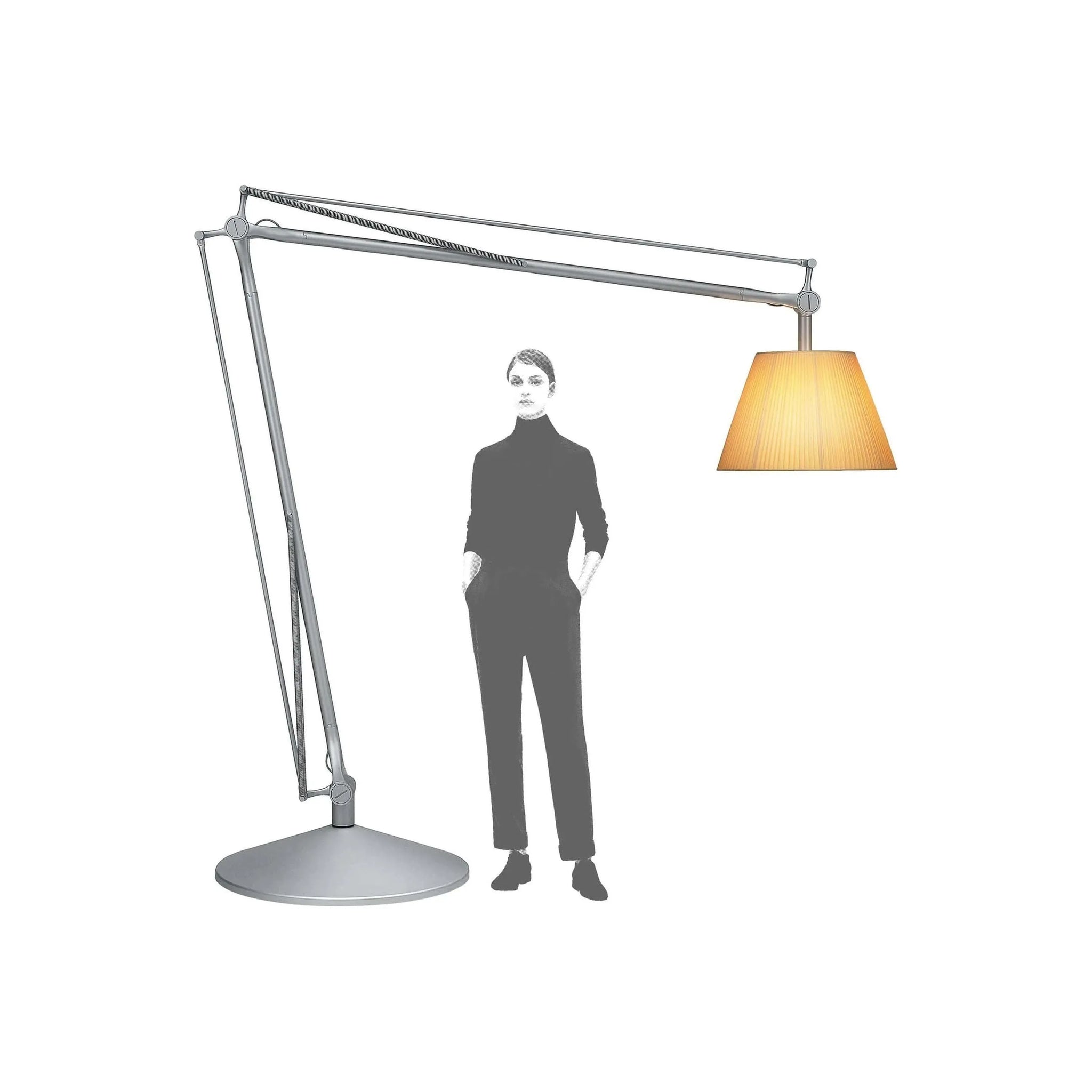 The larger-than-life SuperArchimoon Floor Lamp features an aluminum construction with an Acid etched hand-blown pressed glass internal diffuser and plisse cloth external diffuser. One 250 watt 120 volt T10 type medium base halogen bulb is required, but not included. 0-100% dimmer on power cord. Polarized power cord with silver fabric. 95.27 inch width x 84.25 inch height. Base: 31.1 inch diameter. Shade: 21.65 inch width x 14.96 inch height.