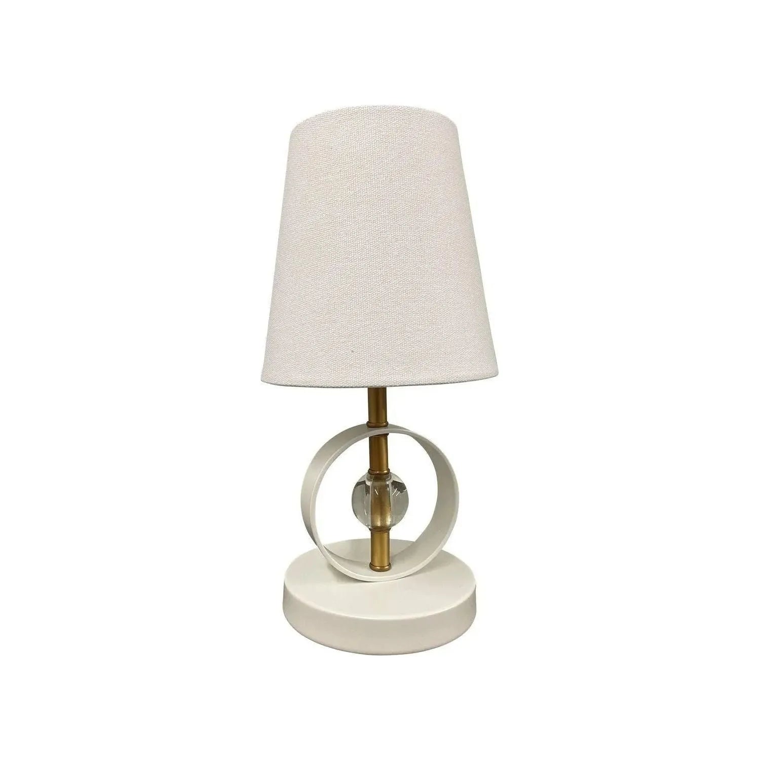 Bryson Ring Crystal Accent Lamp by House of Troy pairs sculptural form with refined materials to create a statement designer lighting piece. A polished metal stem passes through a mint-hued circular ring and a clear crystal orb, producing a balanced focal point beneath a clean, tapered white shade.