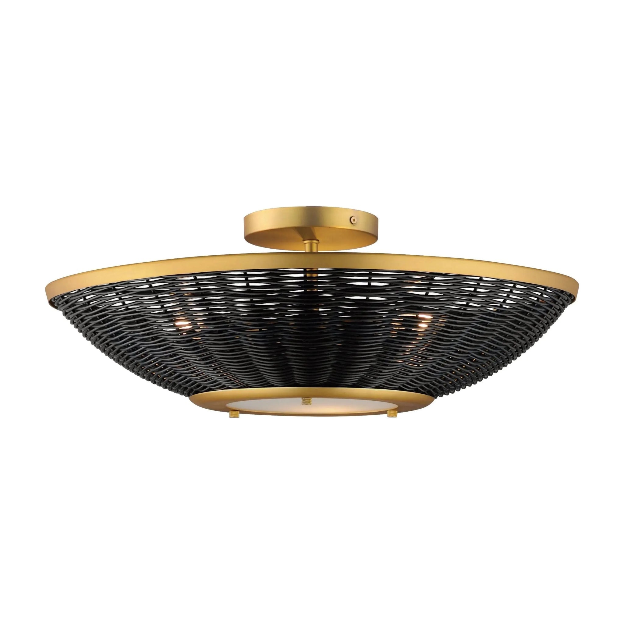 Hand-woven rattan is blackened and configured into a series of pendants and a dual-purpose wall sconce and flush mount. The blackened rattan is contrasted by a frame in Natural Aged Brass that adds a dramatic styling to the natural material. The overall effect is nostalgic, coastal, and yet transitional with a variety of design aesthetics.