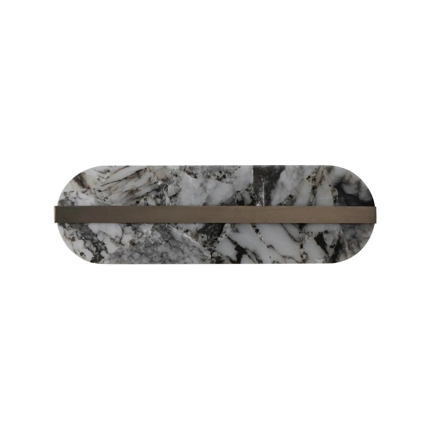 Display the unique beauty of Spanish Alabaster or our proprietary Striae Arya stone composite panels in a modern wall application. Low-profile ADA sconce options in Alabaster or the recycled marble composition cast in glass is illuminated on mirrors and wall decor. Coordinating with Nina Magon's award-winning Megalith collection, these wall fixtures are brilliant enough to stand alone and enhance a room's decor.