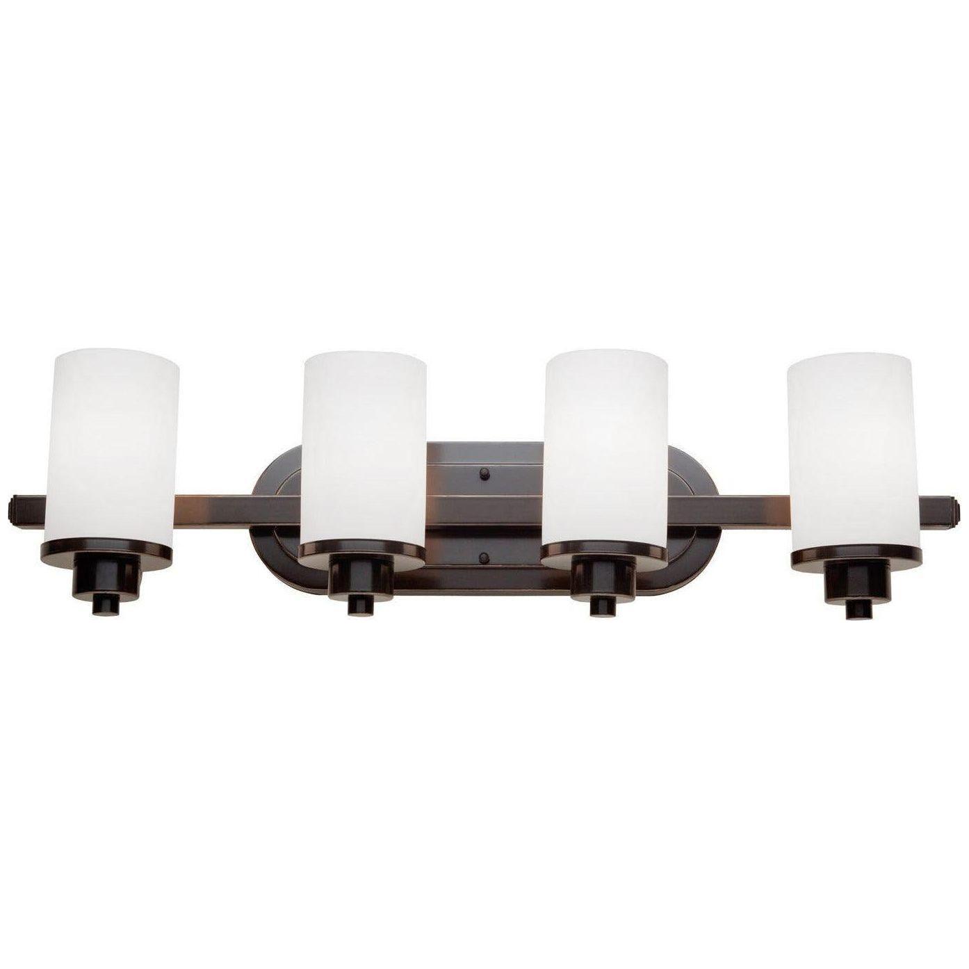 Parkdale Four Light Bathroom Vanity by Artcraft Lighting balances clean modern lines with warm, tactile finishes—designed to deliver even, flattering illumination for vanities and mirrors. The four-cylinder frosted glass shades diffuse light softly while a streamlined metal backplate and arms provide architectural restraint.