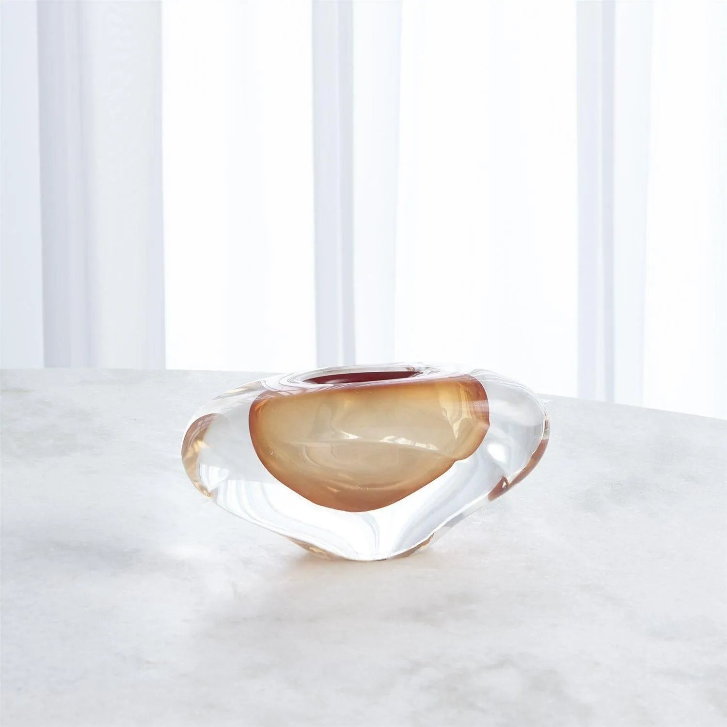 Abstract Bean Vase — a sculptural statement by Global Views that balances organic form with precision craft. Hand-blown and incased in thick clear art glass, the bean-shaped silhouette reveals a suspended pool of delicate teal color that reads like liquid light.