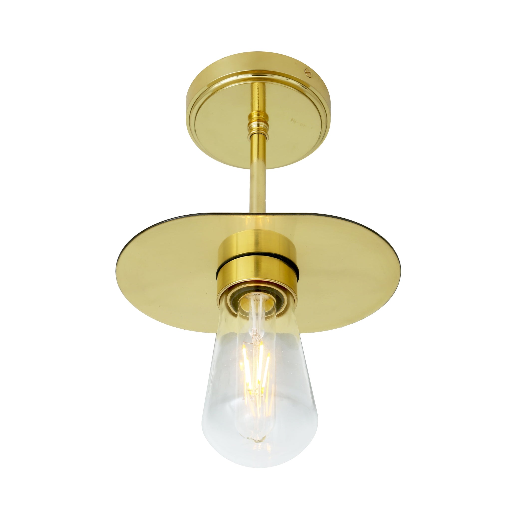 Kwaga Ceiling Light by Mullan Lighting is a study in pared-back refinement—an architectural flush-mount that balances a crisp metal disc with a clear glass-bulb reveal to create focused, ambient illumination. The polished metal canopy and stem demonstrate careful craftsmanship and a finish that reads as modern luxury in residential or commercial projects.
