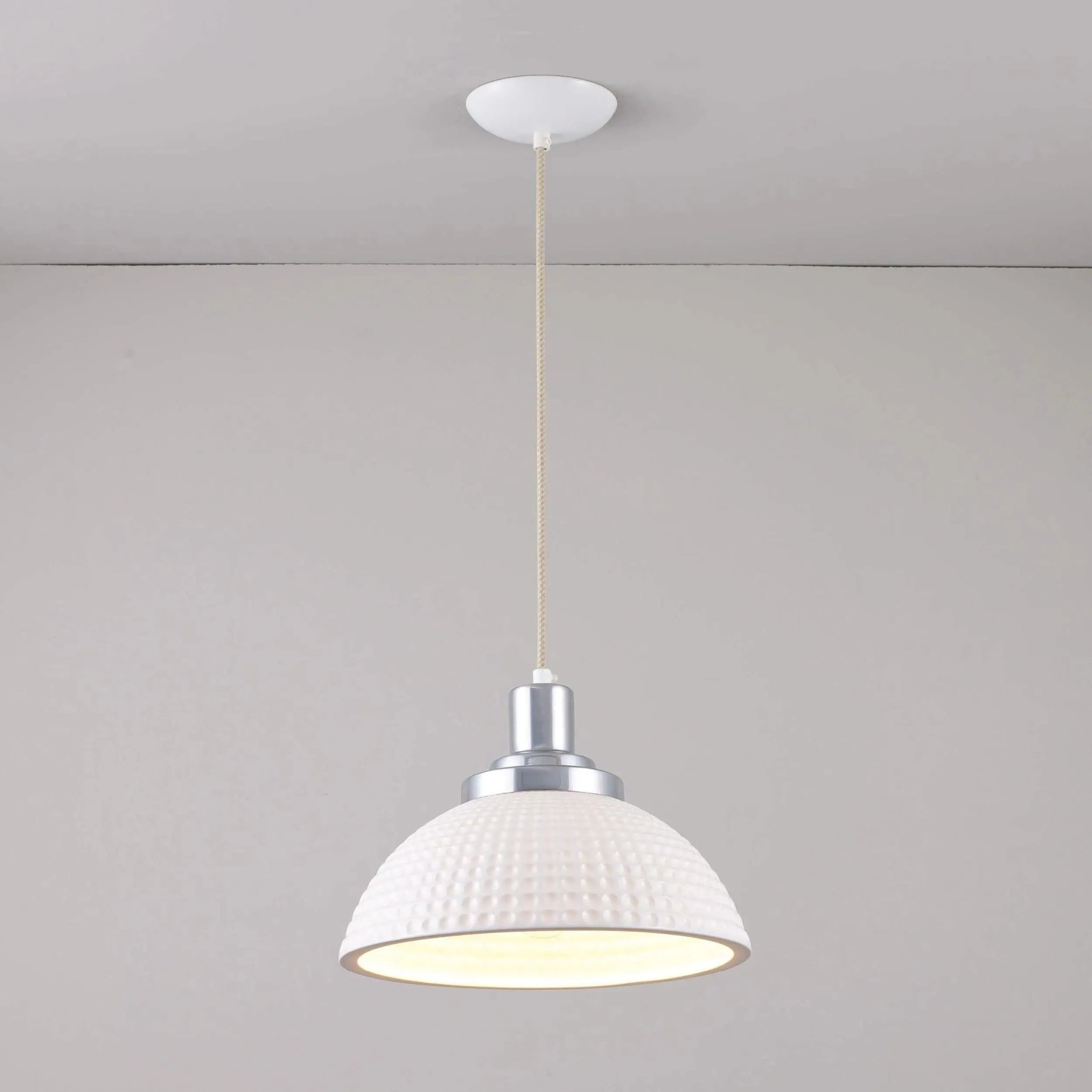 The Cosmo collection includes pendant, rise & fall and table lights with a shortened semi sphere shade. Available in bone china with either a plain, dimpled or stepped finish, the textural shades take on a new dimension when lit. Also available in ribbed prismatic glass.
