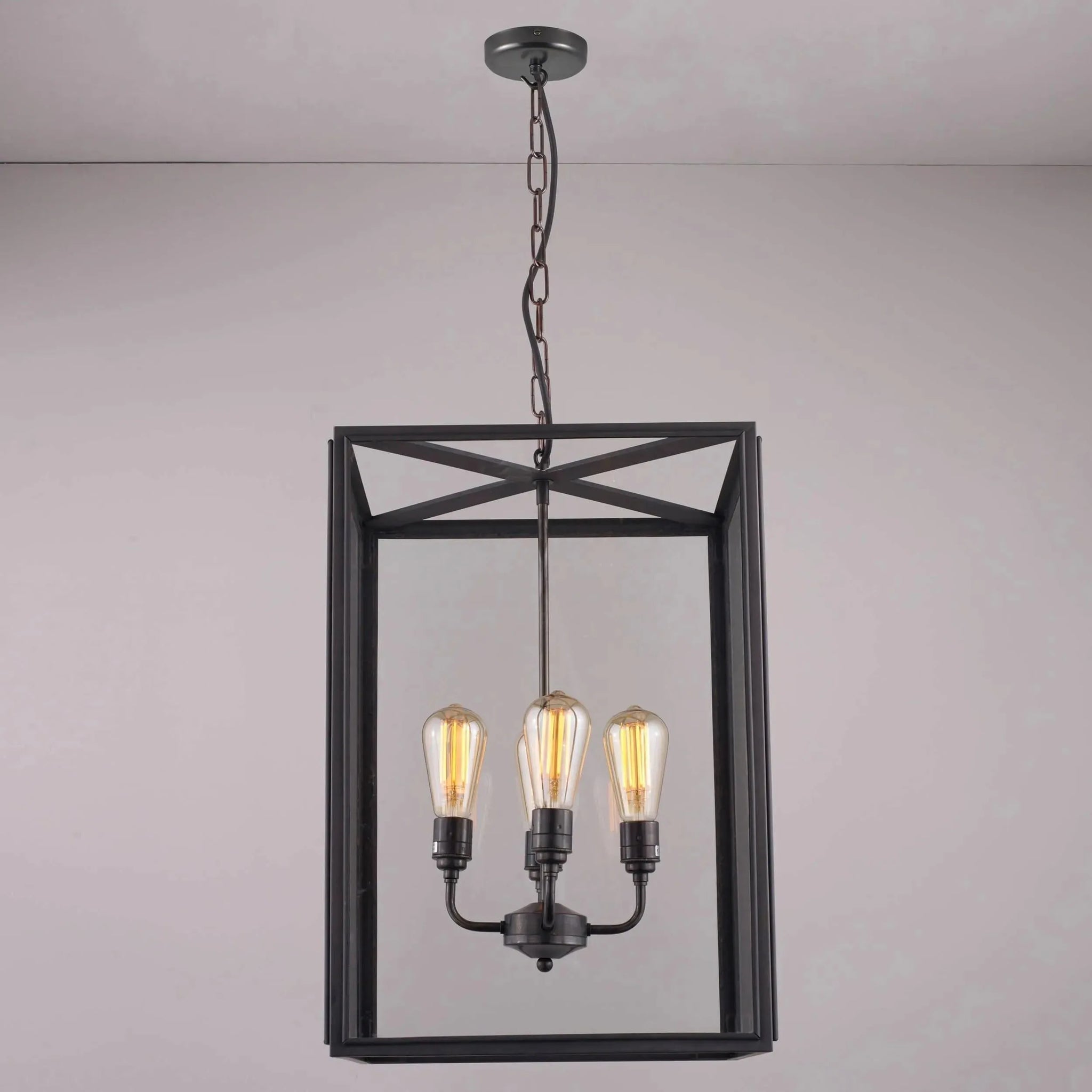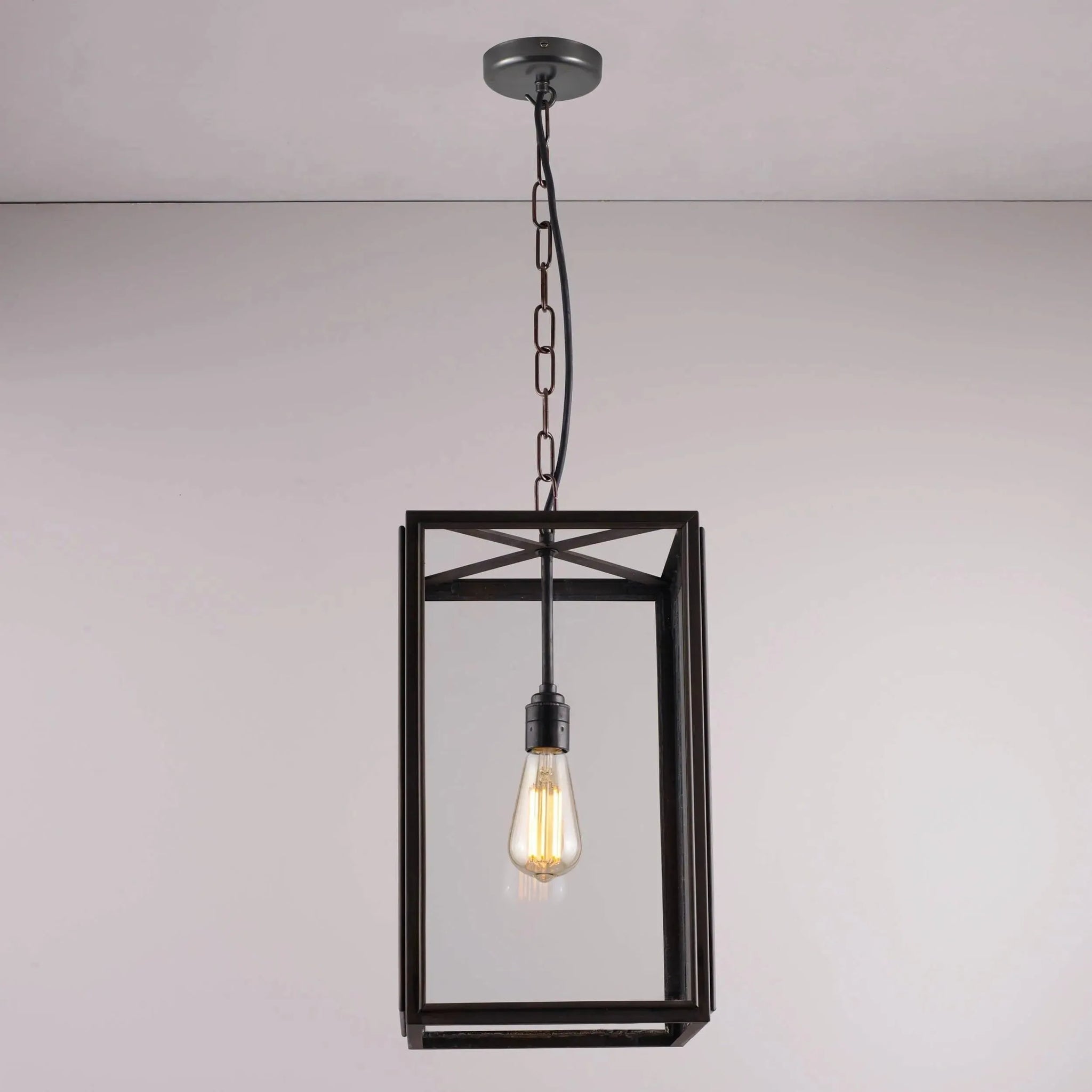Square box pendant in weathered brass, externally glazed and available in three sizes. Suspended on a weathered brass hook 1.5 meters of chain. Glass on four sides, with open top and base.