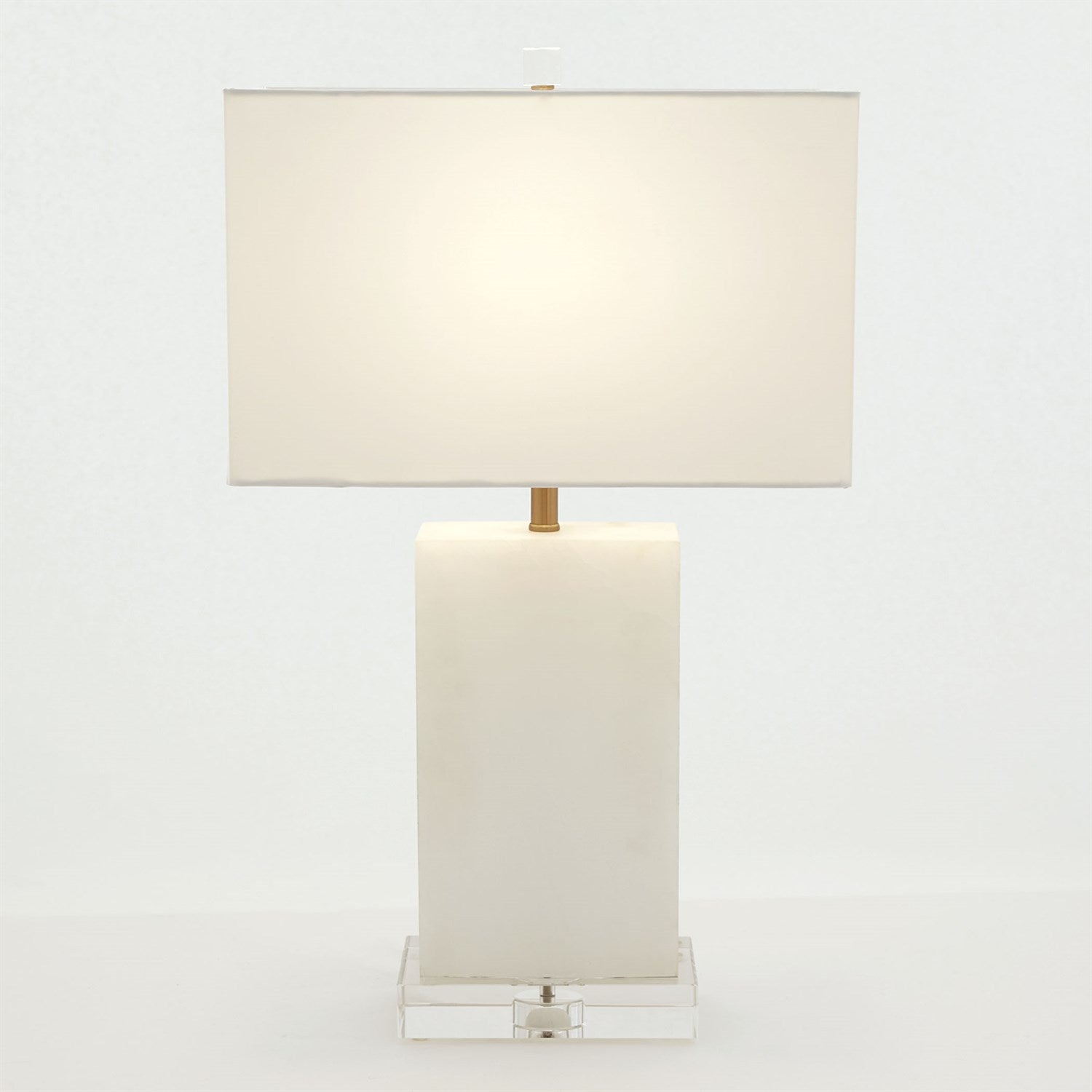 The Alabaster Rectangular Table Lamp is made of four sheets of alabaster forming a cube shape, sits on a solid crystal base and has brushed antiqued brass fittings. Hardback fabric shade. As alabaster is a natural product, please be aware that there will always be variations in veining and color. This is to be expected and makes every alabaster product uniquely your own.