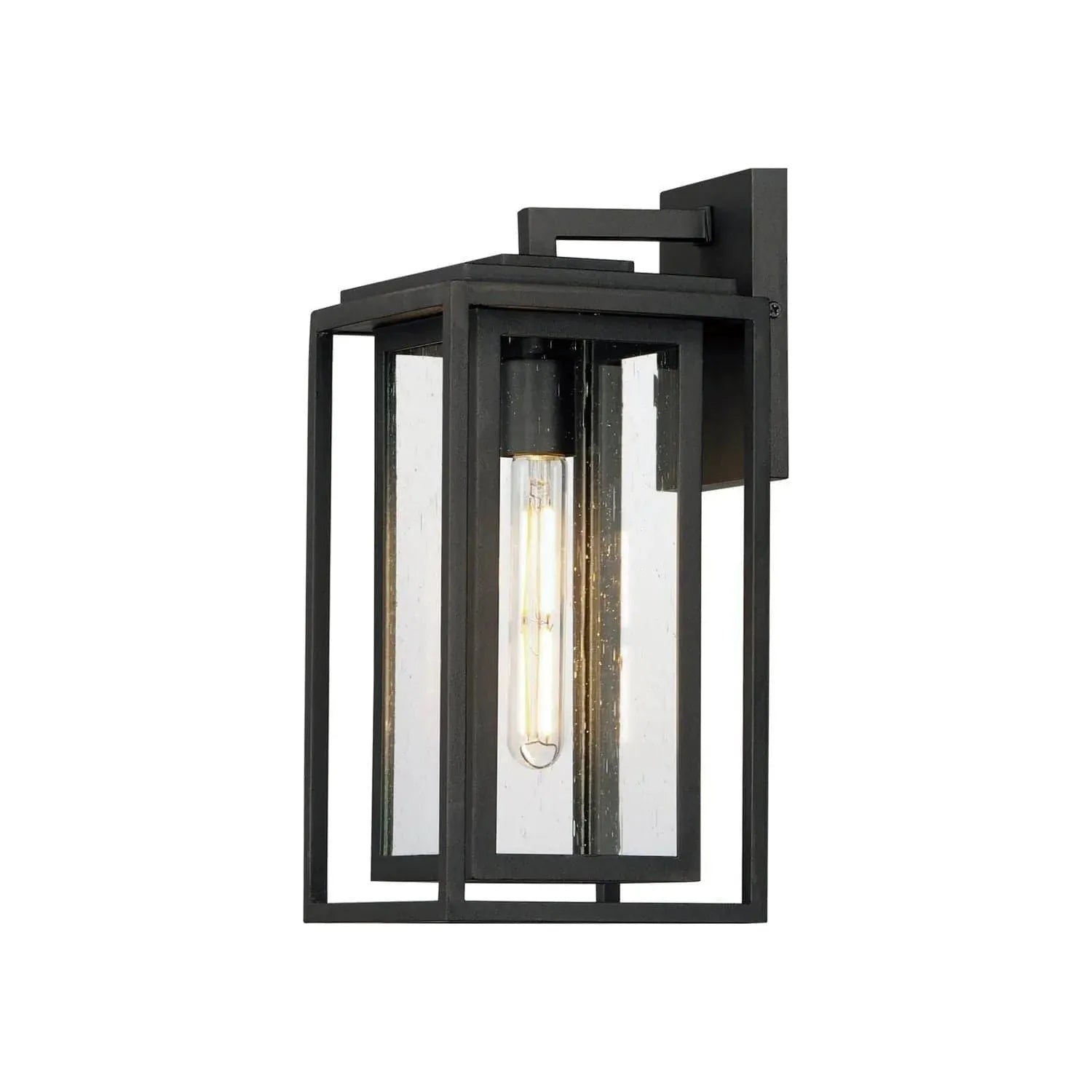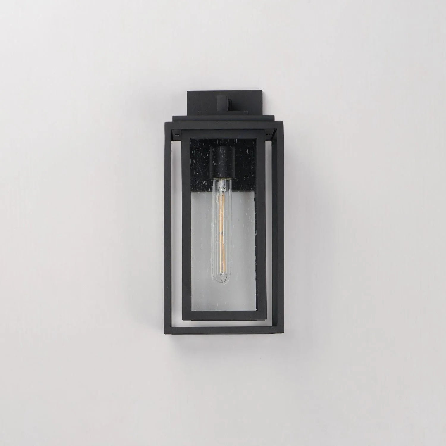 A dual framed structure creates dimension on these outdoor lighting fixtures that is both contemporary and transitional. The construction consists of two frames of square tubing and squared components. The inner frame`s Clear Seedy glass reduces glare from the light and appears dirt-free for longer periods. This is a comprehensive collection to brighten all areas of your outdoor space, available in various sized sconces as well as hanging and post configurations.