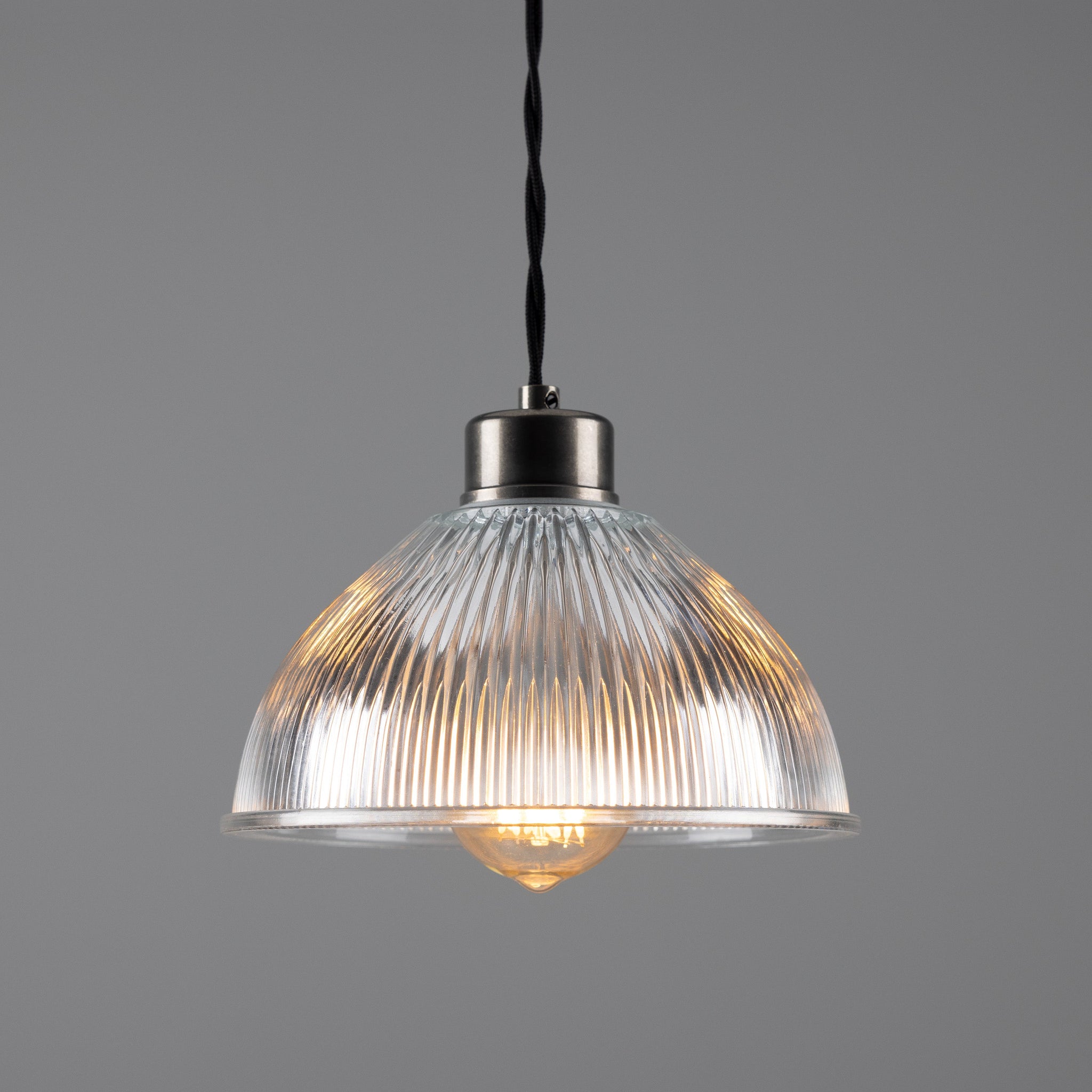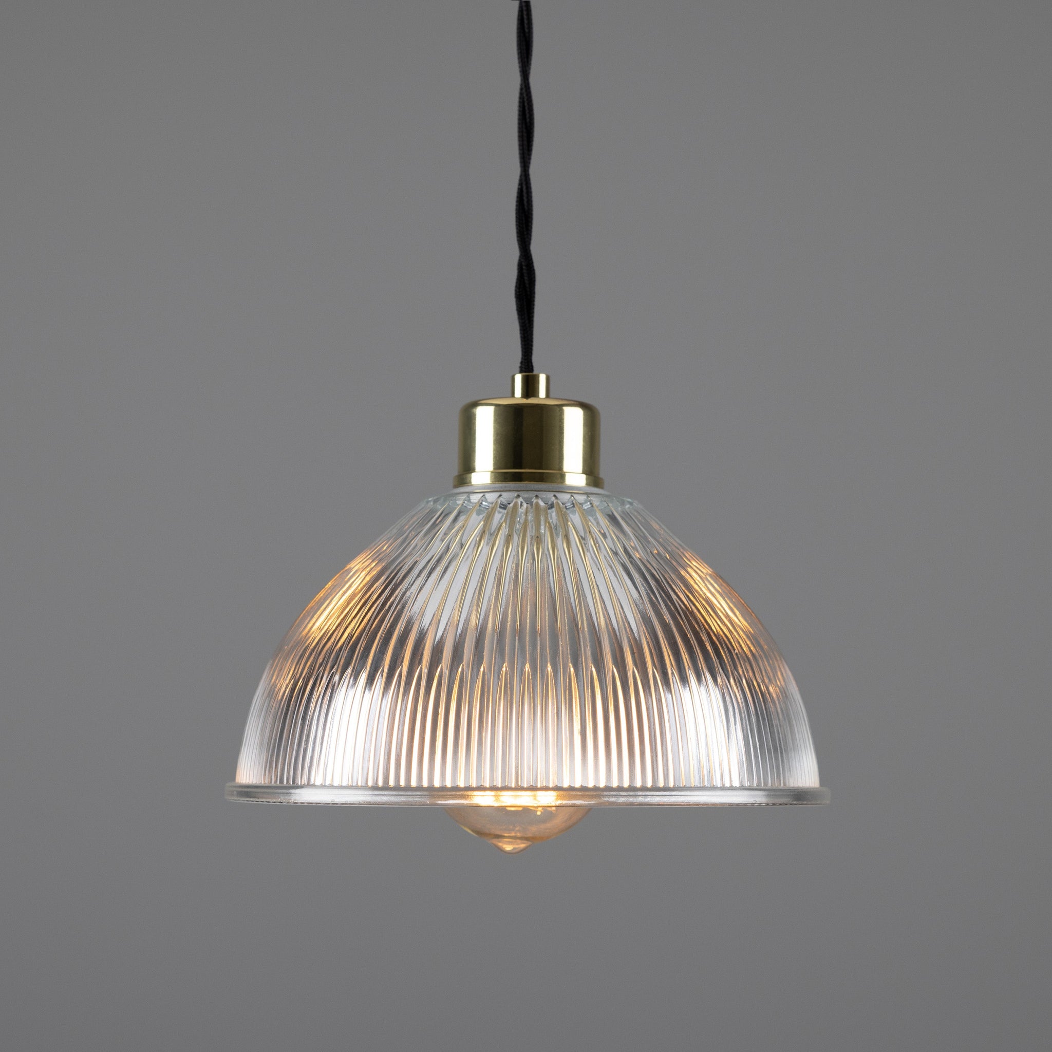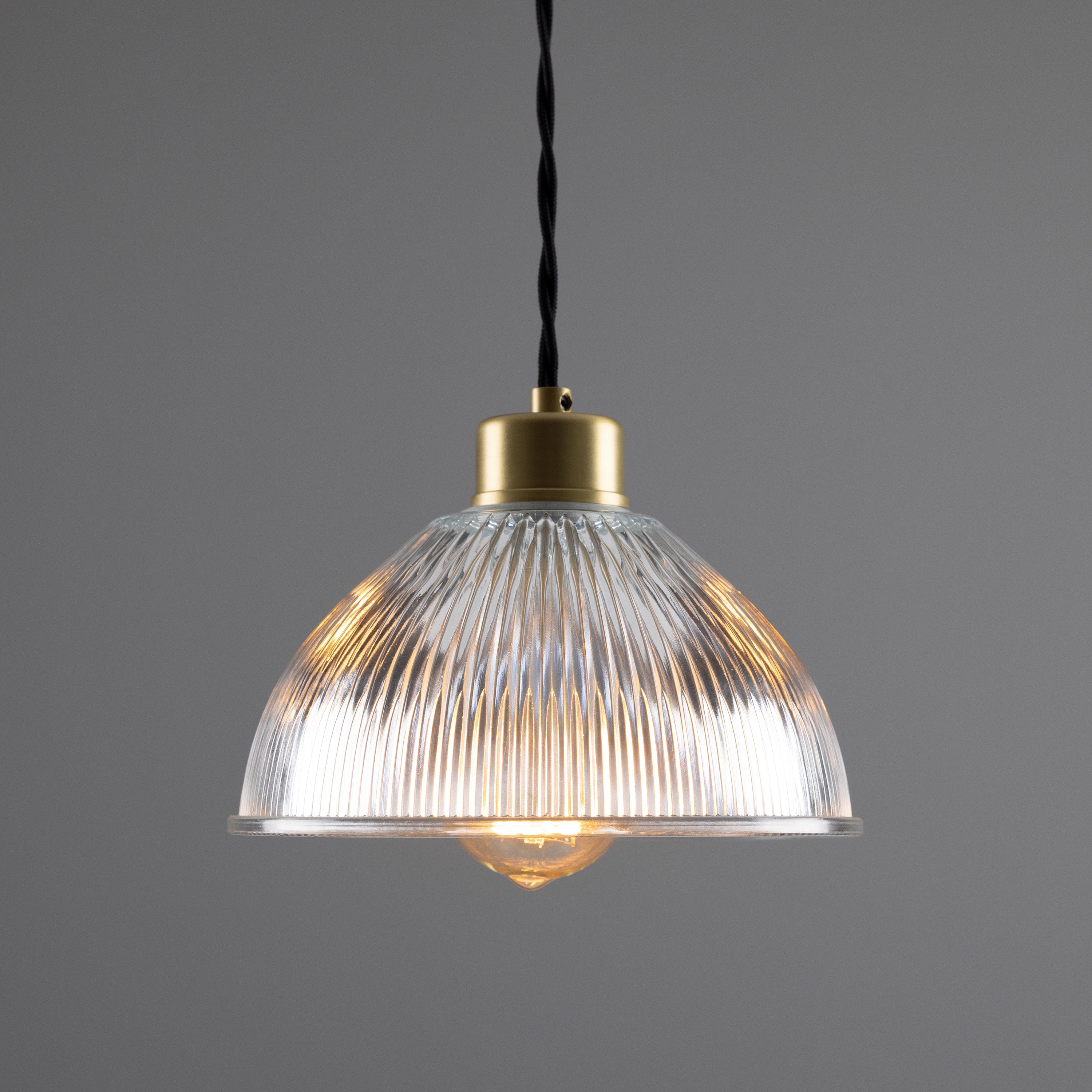 Boston Industrial Holophane Pendant by Mullan Lighting reinterprets classic industrial form with a precision-ribbed holophane glass shade and hand-finished brass canopy. The prismatic glass delivers broad, glare‑controlled illumination while revealing the filament of a single bulb — an elegant focal point for kitchens, bars, and curated commercial interiors.