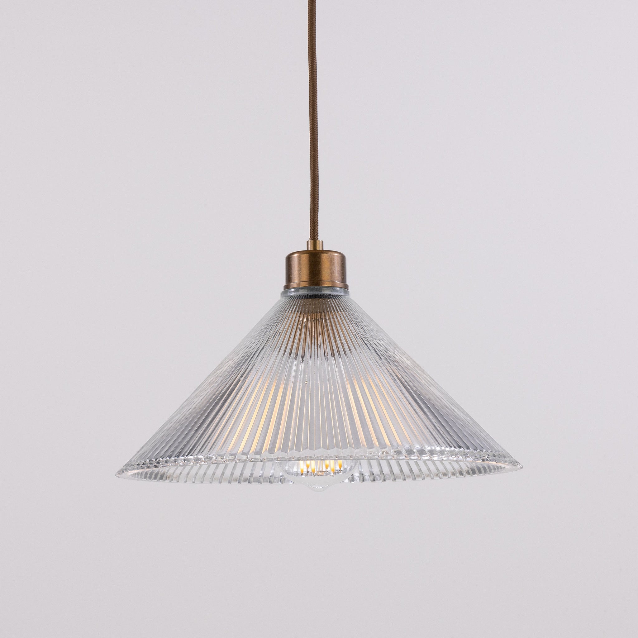 Key design features include a conical ribbed-glass shade, durable metal canopy, and a discreet cord that emphasizes clean lines. Its measured scale and neutral profile make it ideal for modern, minimalist, transitional, and hospitality interiors, where it functions as task lighting or clustered composition.