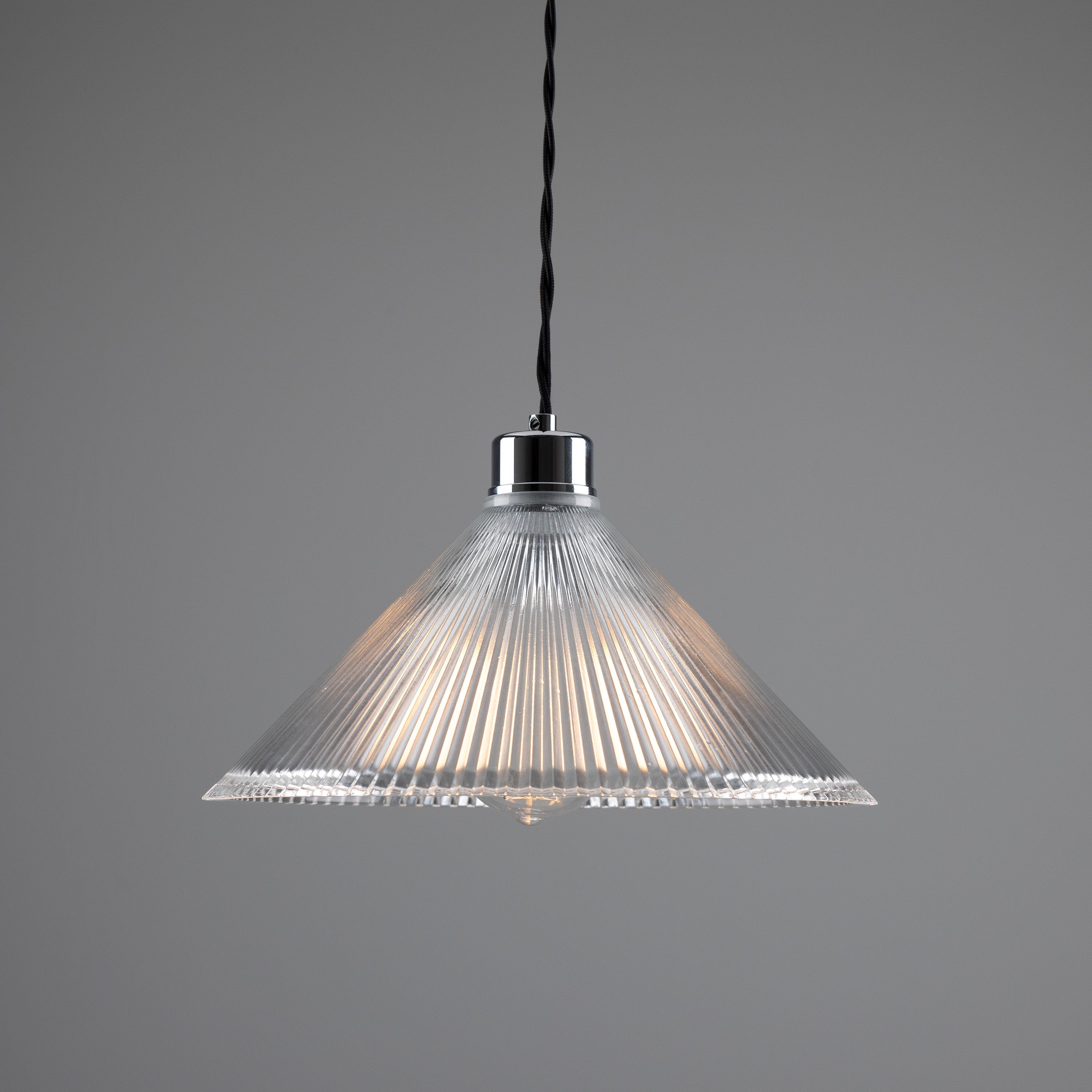 Rebell Pendant by Mullan Lighting is a study in refined utility — a designer lighting piece that pairs a flared, ribbed glass shade with a compact metal cap to deliver focused illumination and sculptural presence. The precise glass fluting refracts light for an even, ambient glow while revealing the quality of hand-finished craftsmanship.