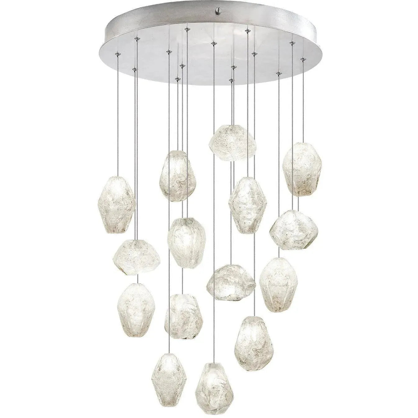 Fine Art Handcrafted Lighting presents a sculptural 21" pendant that reads like suspended geology — a constellation of fifteen clear, random-cluster glass orbs cascading from a low-profile round canopy. The handcrafted natural quartz glass clusters refract light with a crystalline, tactile quality, while the platinized silver leaf canopy and slim suspension cables keep the composition airy and precise.