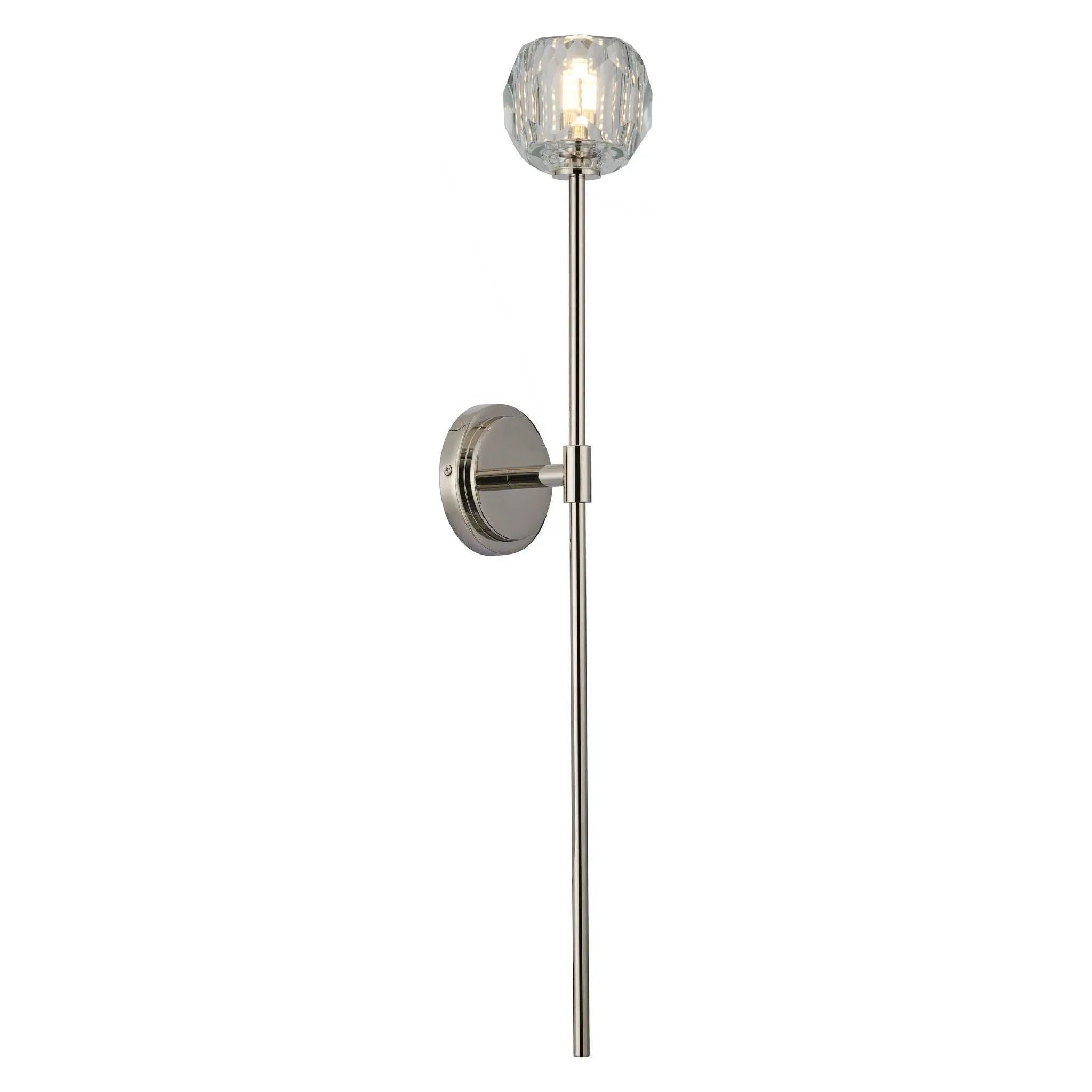 Aluce 3601L Wall Sconce refines vertical lighting into a sculptural statement — a slender, long-rod silhouette crowned by a faceted crystal-clear globe that refracts light with elegant precision. This designer lighting piece is conceived for form-forward interiors that demand subtle drama and measured luxury.