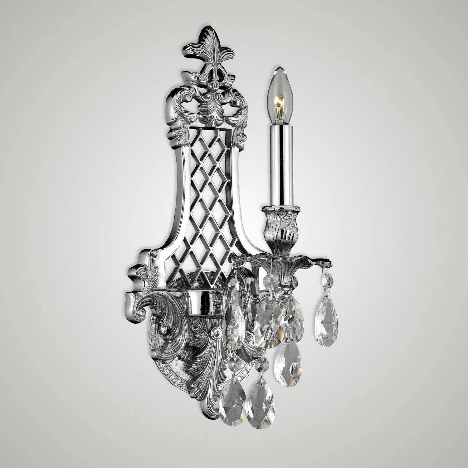 Brass and Crystal Lattice Wall Sconce — a considered statement piece from American Brass & Crystal that pairs architectural form with refined ornament. A lattice backplate and sculpted brass arm create structured silhouette while faceted crystal drops refract light for subtle sparkle.