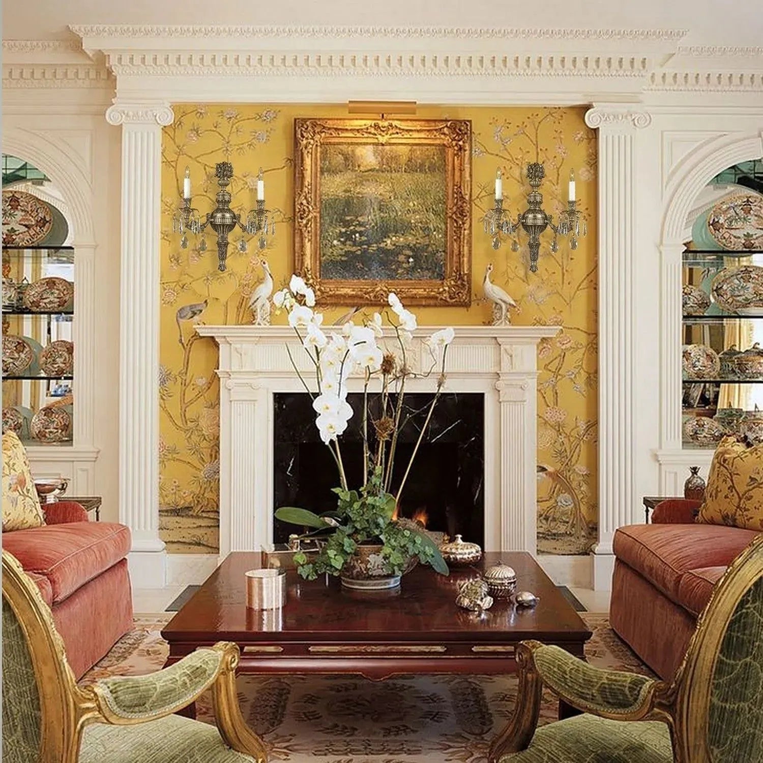 Hand-finished brass hardware and precision-cut crystal pendants articulate a balanced profile (approx. 18" W x 22" H x 5" D). Dual candelabra sockets accept E12 bulbs to deliver layered, dimmable illumination. The carved backplate, fluted center column and teardrop crystals reflect meticulous craftsmanship and proportion.