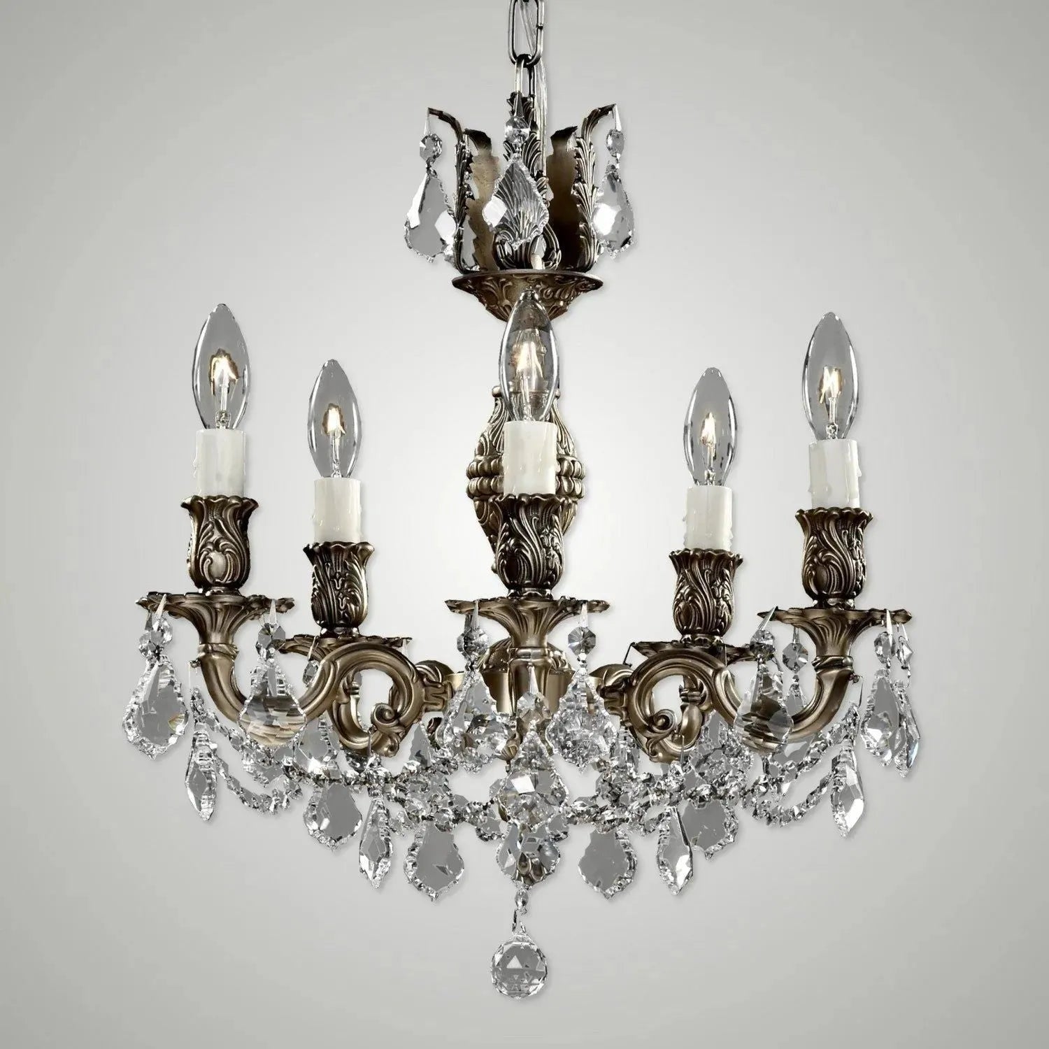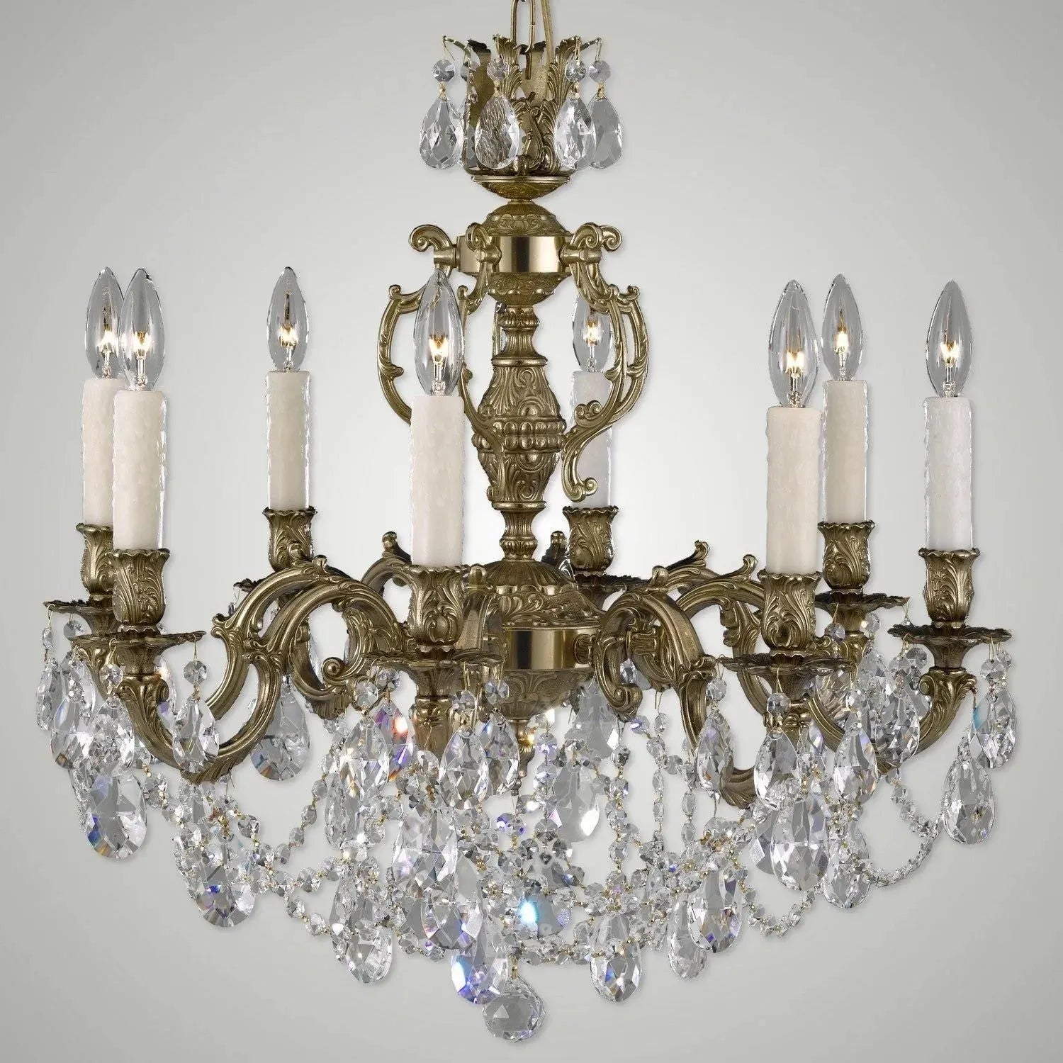 Rosetta Brass and Crystal Chandelier by American Brass & Crystal is a considered centerpiece that pairs classical form with precise, modern detailing. Sculpted brass arms and acanthus-carved sockets frame cascading crystal drops that refract light with crisp clarity—designed to elevate entryways, dining rooms, or boutique commercial interiors.