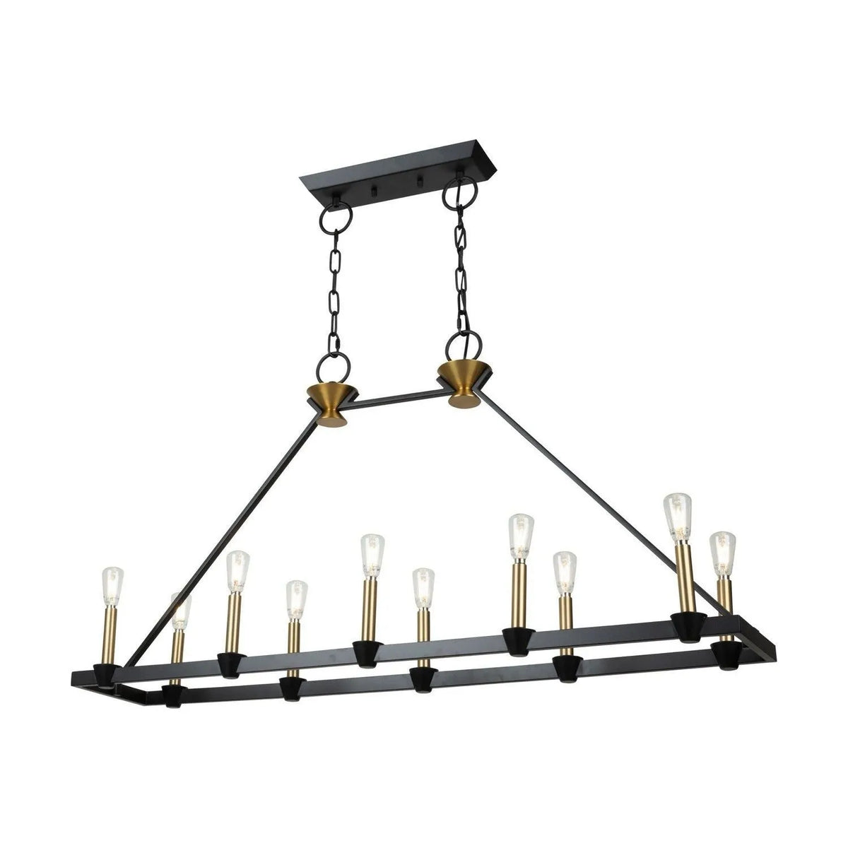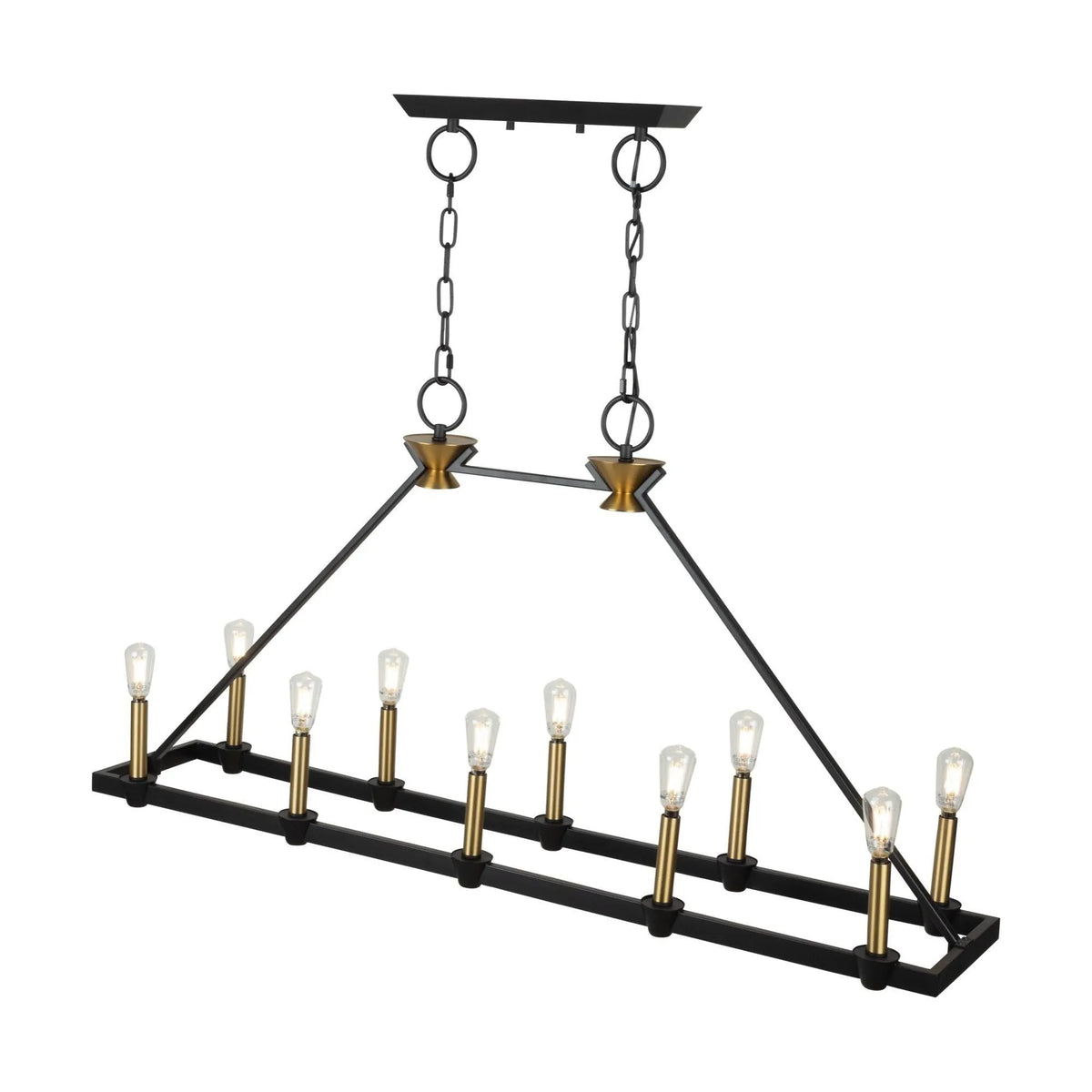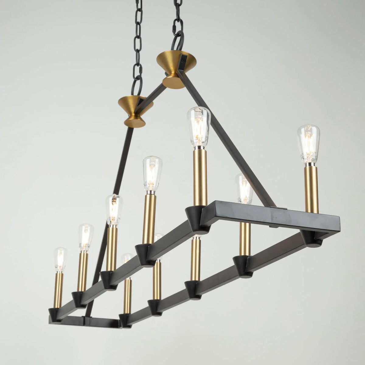 The hand-finished black metal frame and polished brass candle covers create a striking two-tone contrast. Precision-crafted arms hold ten E12 sockets across a 45" linear span, delivering even, ambient illumination for large tables and islands. Height is adjustable via chain for tailored sightlines.