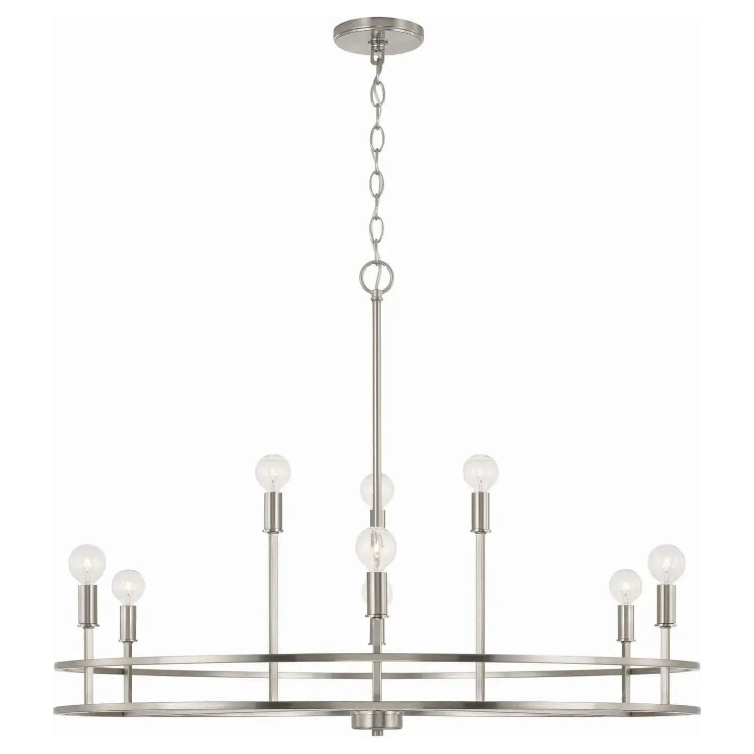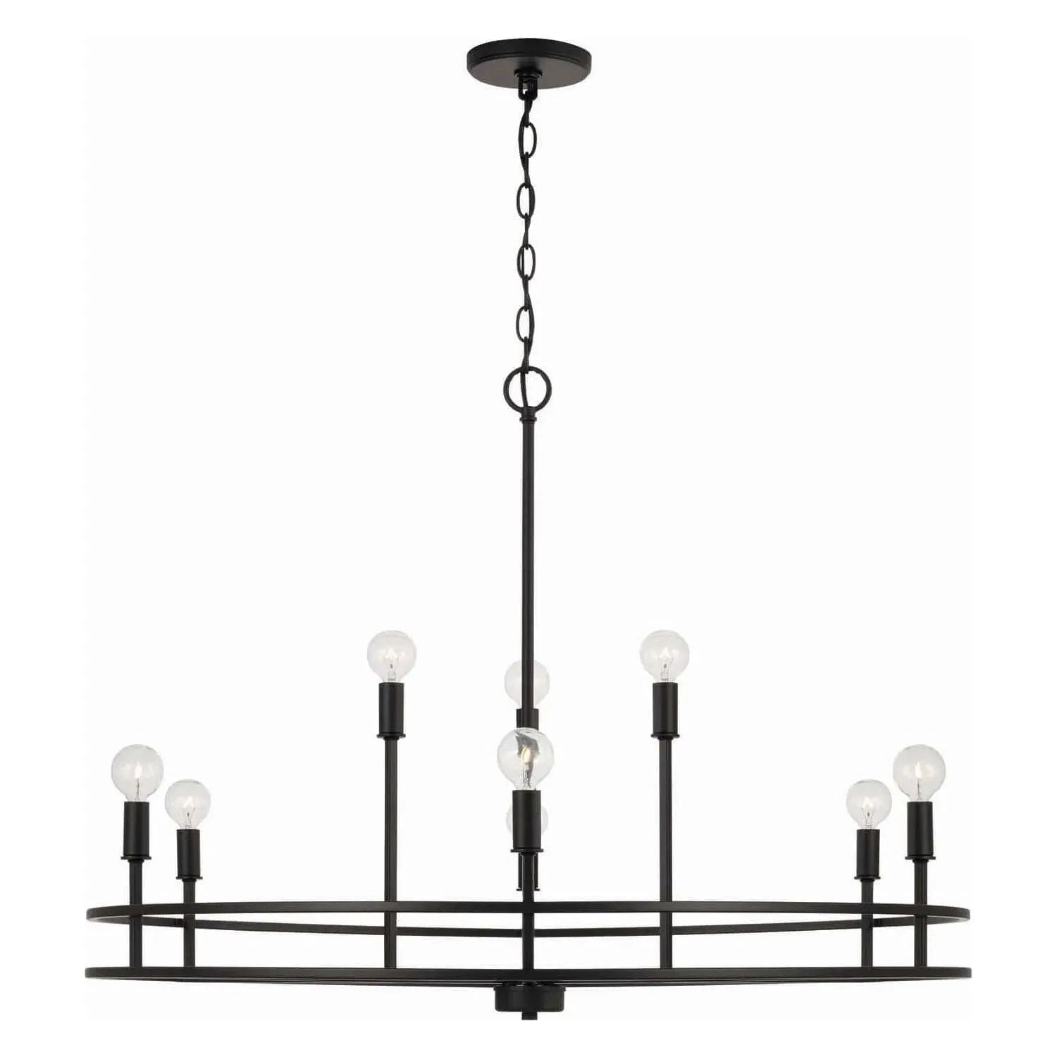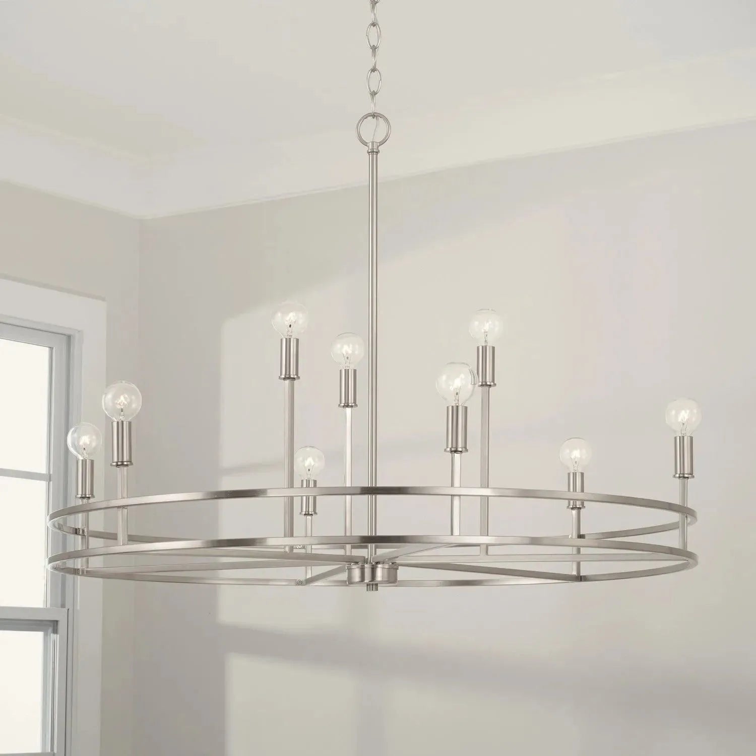 Fuller 9-Light Chandelier by HomePlace redefines contemporary elegance with clean lines and a sculptural silhouette. This striking fixture features a circular form illuminated by staggered tiers for a warm, multi-dimensional glow.