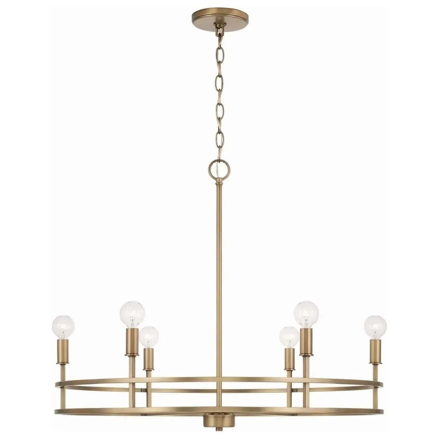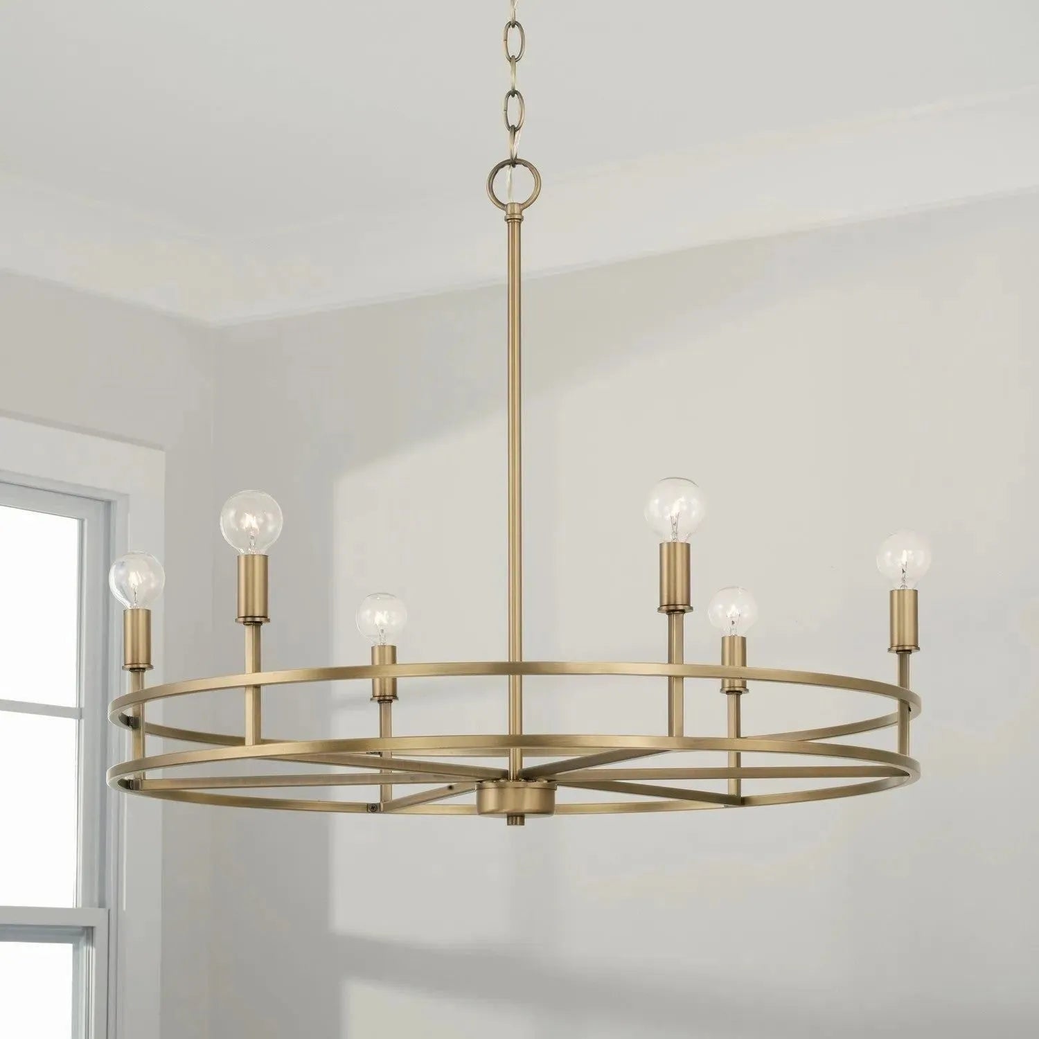 The Aged Brass finish adds mid-century sophistication to any space, whether above a dining table, in a foyer, or in an open living area.