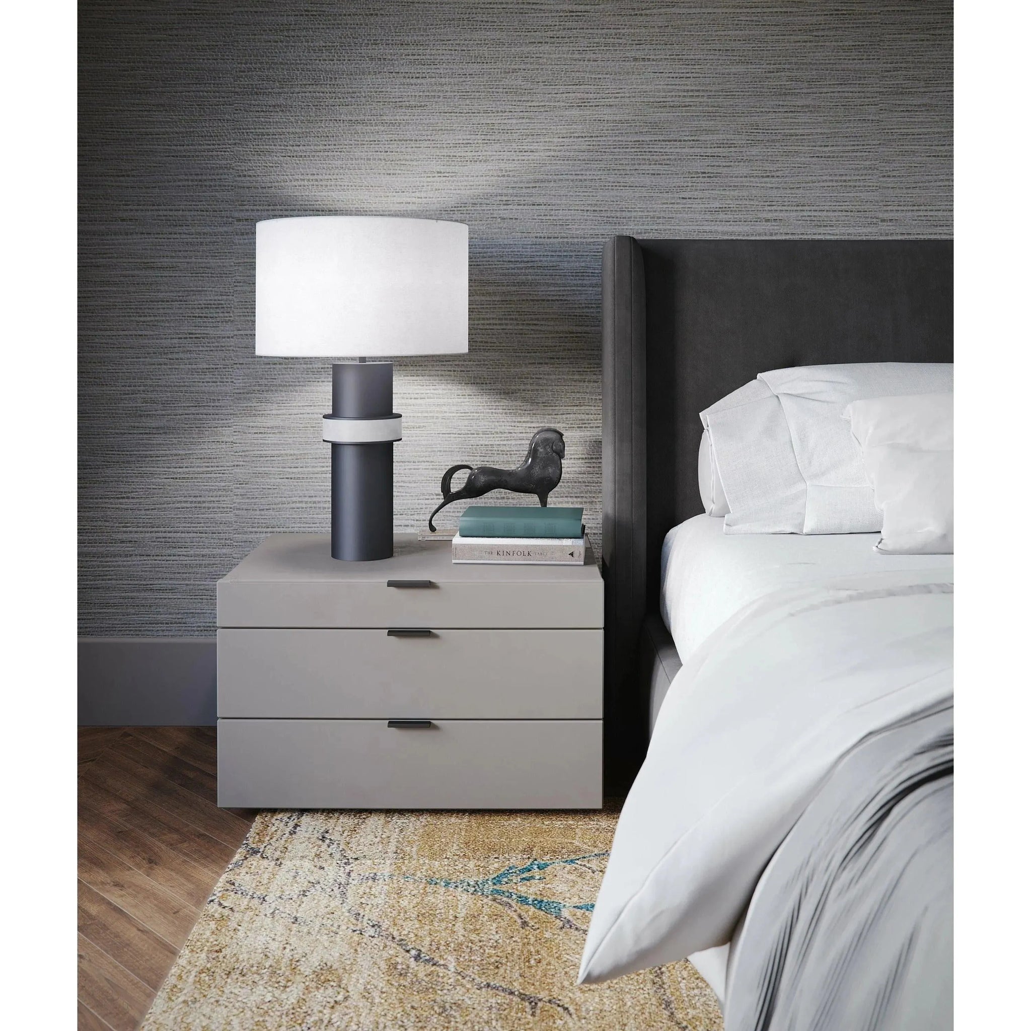 The balanced proportions of this cylinder table lamp gracefully suspend a ring of alabaster on a black matte metal column. The off-white cotton drum shade frames this beautiful and rich stone.