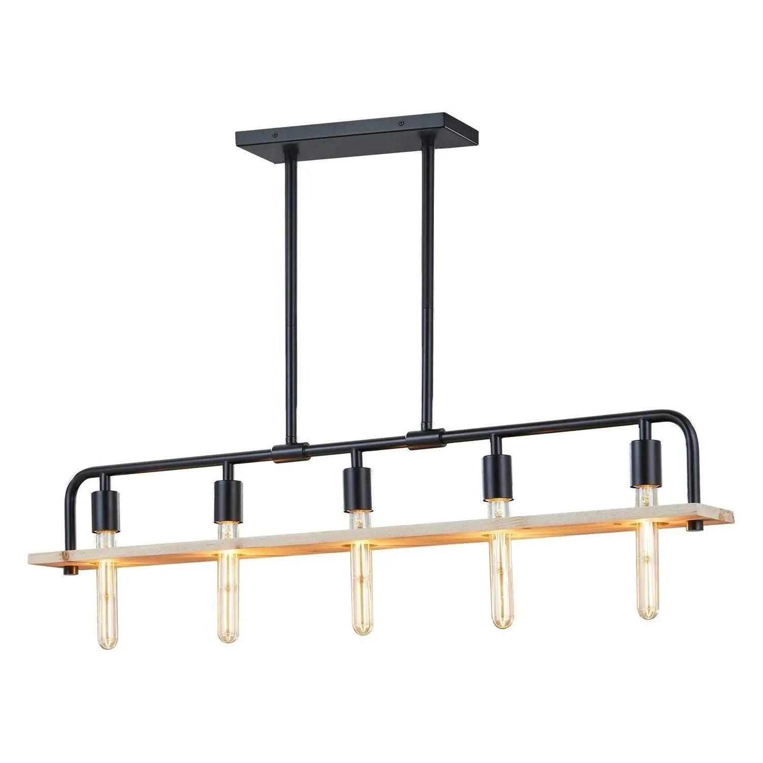 Loft Island Chandelier by Justice Designs translates industrial clarity into a refined statement piece for contemporary interiors. A slender black metal frame suspends a natural-finish wood shelf that reads as both structural and sculptural, while five exposed tubular sockets deliver directional, ambient light for kitchens, islands, or dining runs.