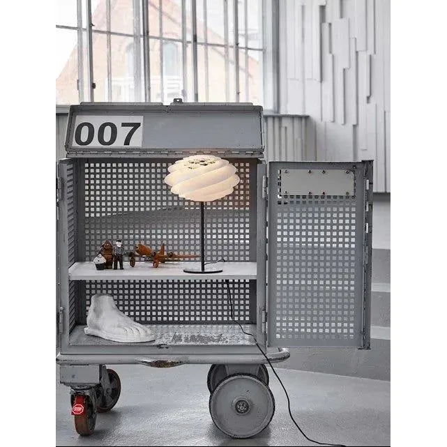 Designer Oivind Slaatto found inspiration for the Swirl Table Lamp's unique shade from spirals found in nature and mathematics. Drawing on the shapes seen in a snail's shell and fractal patterns, the Swirl's White PVC shade disperses light while concealing the light bulb to reduce glare. The lamp's simple Black metal base and stem help draw attention to the sculptural shade. On/off switch on cord.