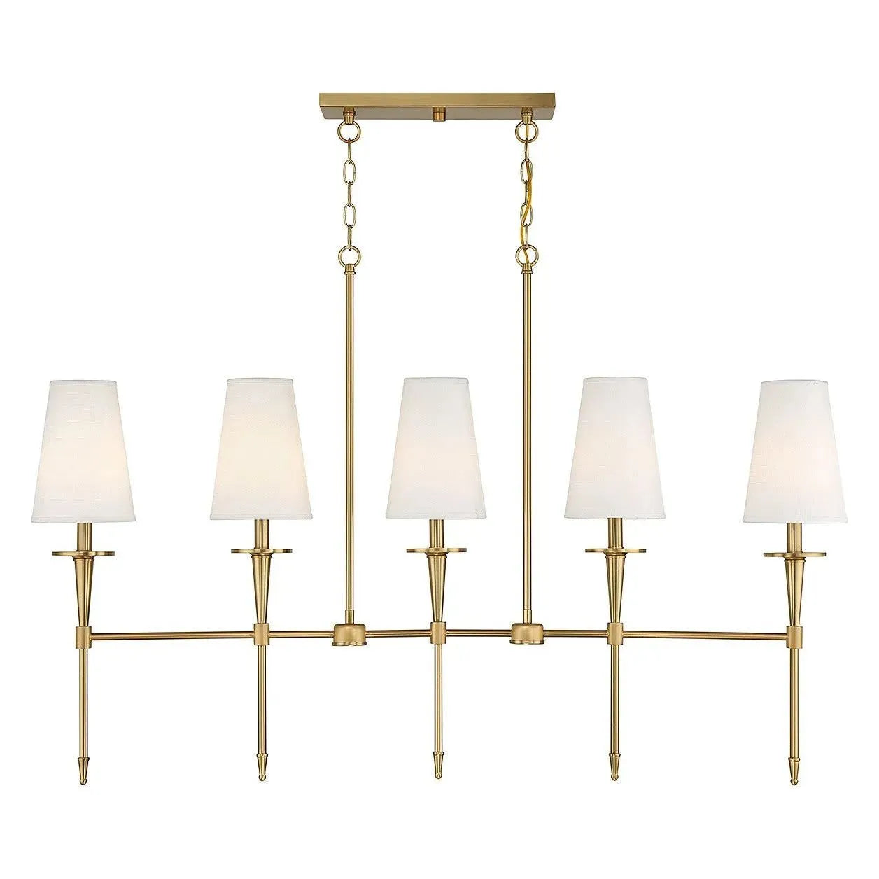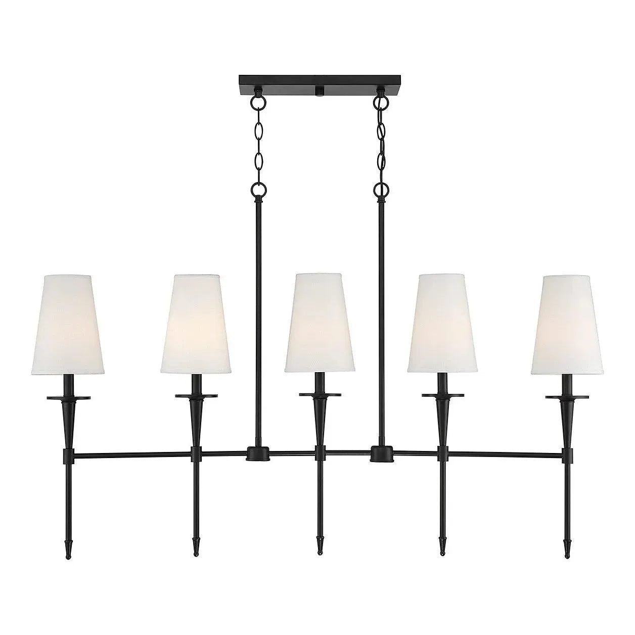 This Trundle linear chandelier is a premier example of Neo-Traditional styling. Its sleek arms taper down to eye-catching points and are topped with white fabric shades for a bright yet comfortable glow. Warm brass or matte black finish. Adjustable height.