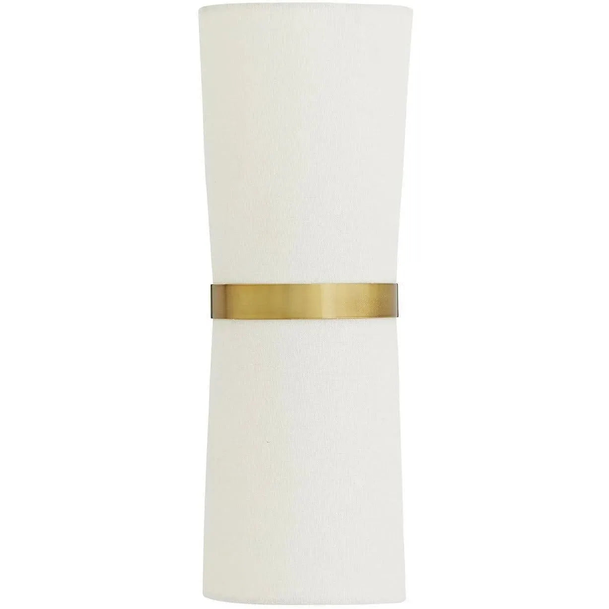 Inwood Wall Sconce by Arteriors balances sculptural restraint with warm, functional light—two tall, open-ended linen shades are cradled by an antique brass band to deliver up-and-down illumination that defines a room without dominating it.