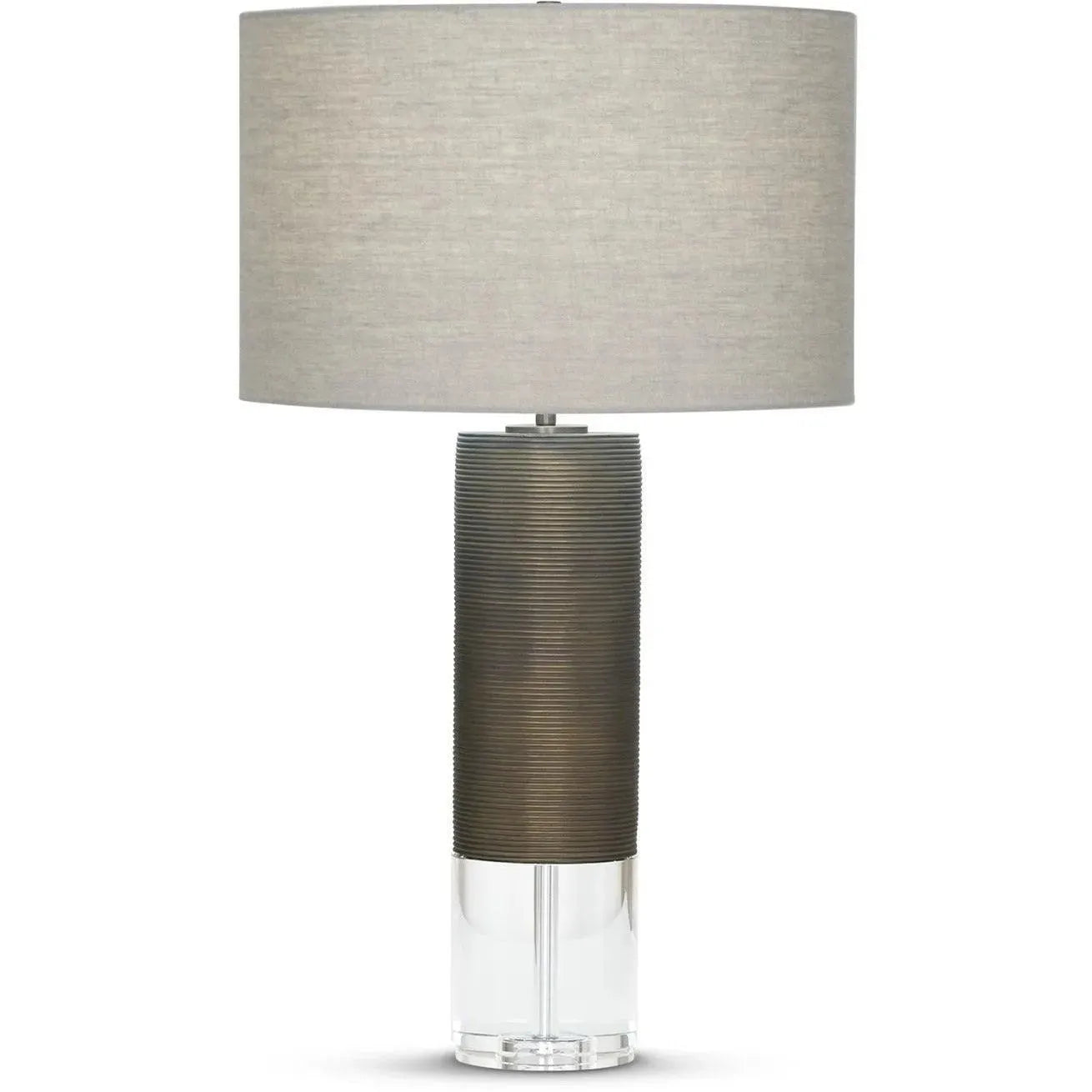 Contemporary meets antique in this stylish table lamp. Pairing a crystal column with a ribbed bronze detail makes for a versatile piece of lighting perfect for modern, farmhouse or even coastal interiors. A Beige linen drum shade completes the look. Available in a smaller size, as well as with a coordinating floor lamp. Also available in antique brass, black, off-white and wood finishes.