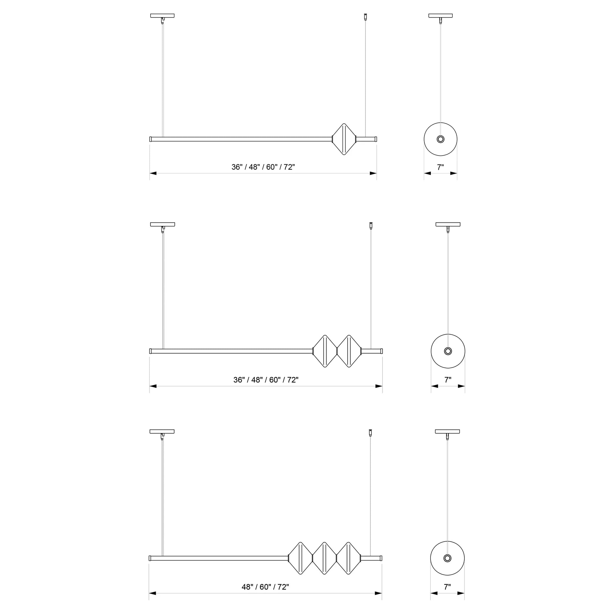 The Gem Linear Pendant features a sleek brass frame adorned with handblown glass diffusers. Each jewel-like glass shade houses an integrated LED light source to product gentle, warm lighting. The Gem Linear Pendant can be displayed on its own, or multiple pendants can be grouped together to create longer or overlapping arrangements. Includes 60 inch suspension cables which can be adjusted on site.
