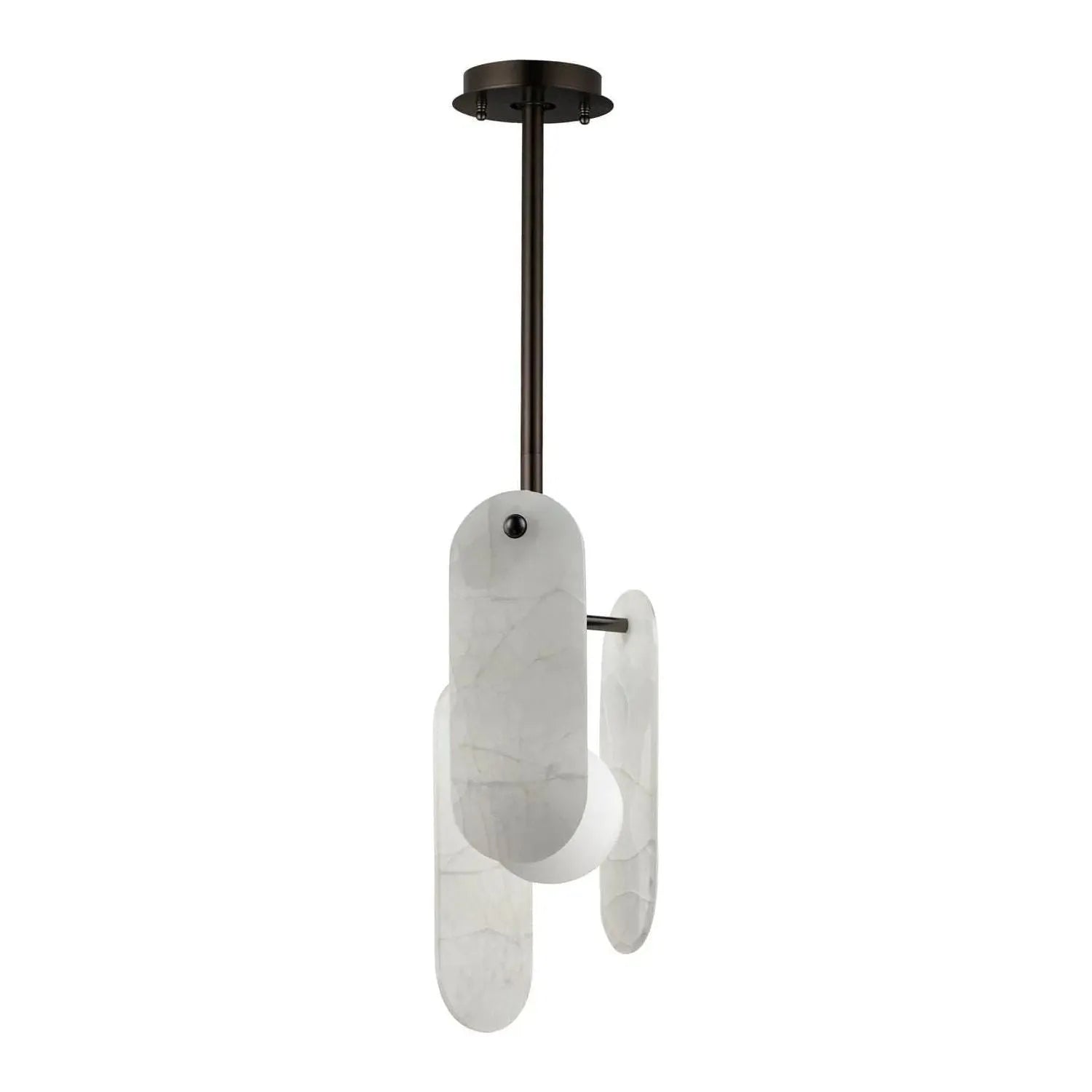 A monument to the beauty of stone, the Megalith collection is constructed using a robust iron stem that branches off to support various panel options. These various elliptical panels are back lit with globes of white cased glass. Choose from stone panels sets including Spanish Alabaster, a pleasantly pink Rose Jade, White Onyx or a breathtaking Striae Arya with dramatic veining and dark grey color tone. The enduring appeal of the stone`s character boosts the luxurious nature of this design. The framework is available in Gunmetal or Brushed Bronze and made to order configurations for quick modifications. For a more modern, futuristic approach to the design, the Megalith collection is also offered in a retro dichroic glass option.