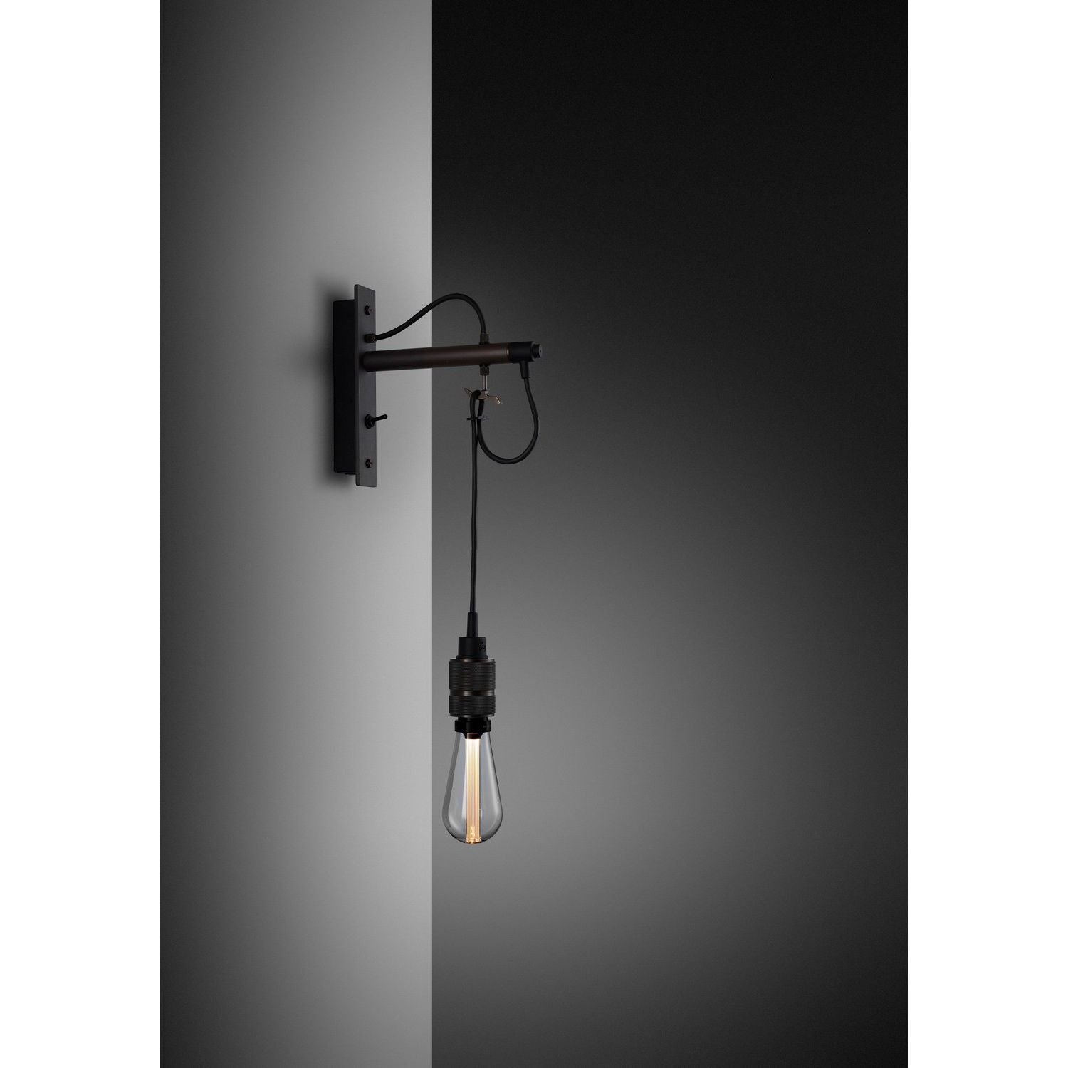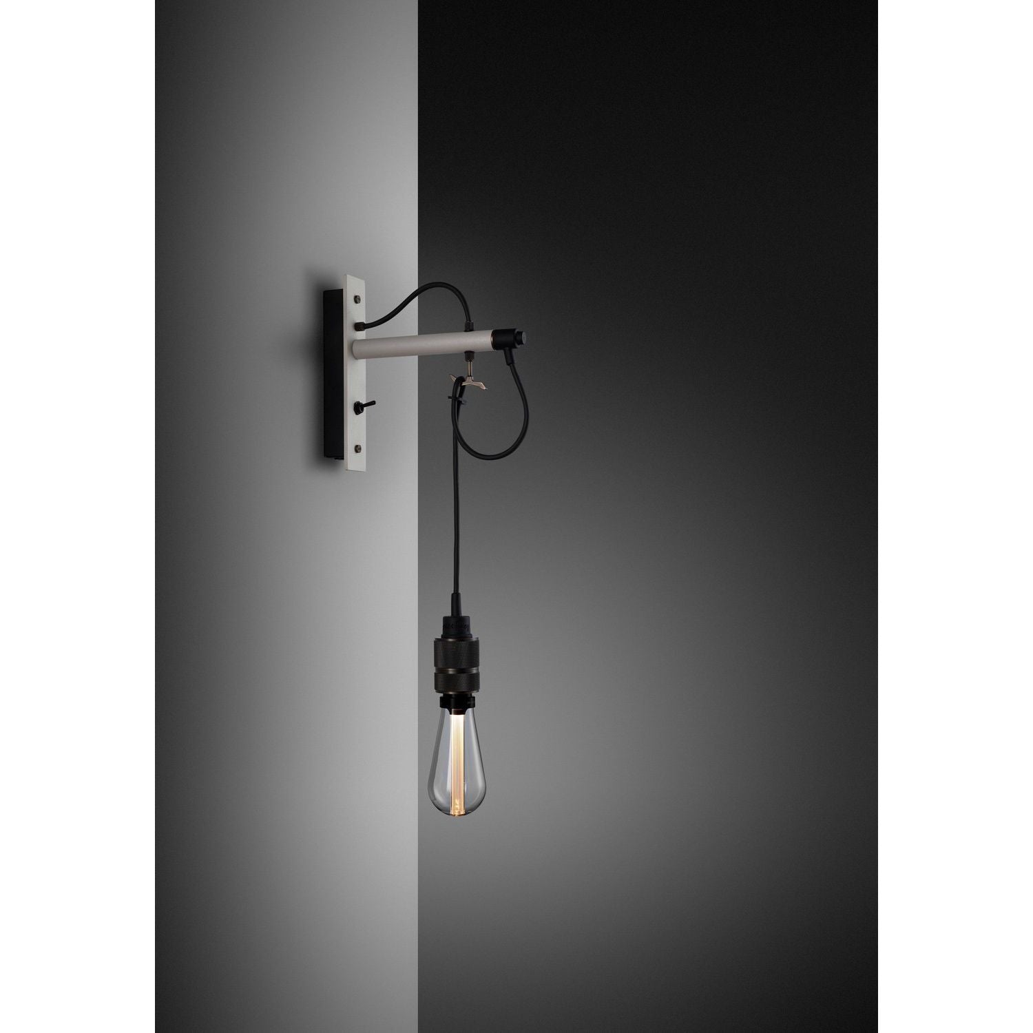 A wall light made from graphite powder coated metal with solid steel, brass or smoked bronze detailing.