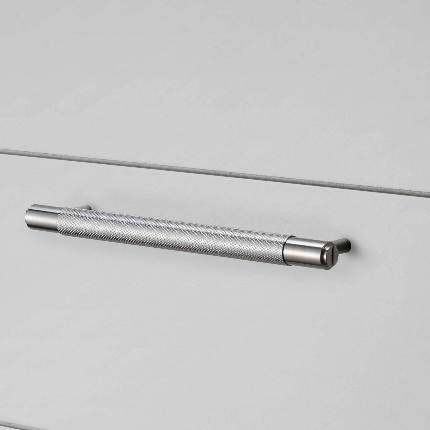 A pull bar made from solid black anodised metal. This pull bar features our signature, diamond-cut, cross-knurl pattern and is refined by hand. They work great on cabinet doors, wardrobe drawers, cupboards, kitchen units and just about anything that can open.