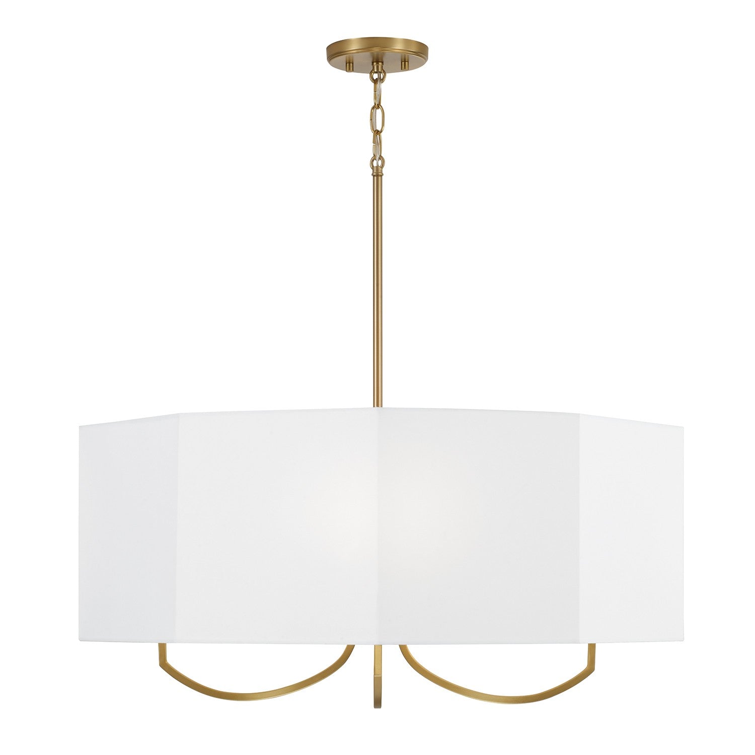 Geometrically inspired, the Adrian Small Chandelier brings a structural silhouette with high style. The White fabric octagonal drum shade and faceted candle sleeves create striking dimension, while the Aged Brass finish adds a classic touch.