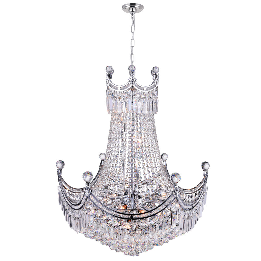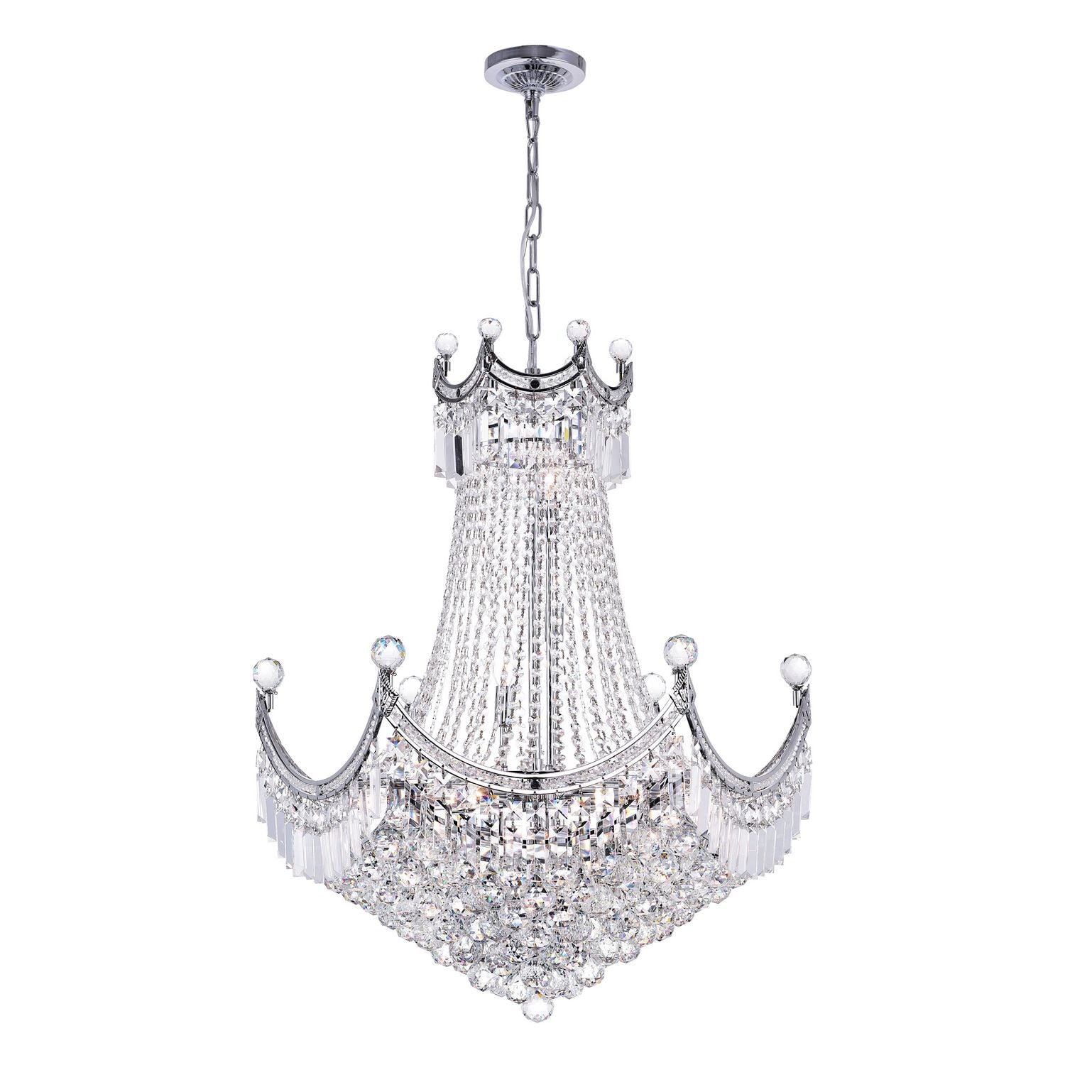 Make a smart lighting choice today and get the Amanda 15 Light Chandelier for your home. This down chandelier is beaded in detail with faceted crystals. It has a pagoda inchspired silhouette that gives it a Chinoiserie chic look. This light source measures 28 inches and 34 inches tall (excluding chain) and is perfect for making a good first impression in the entryway or living room.