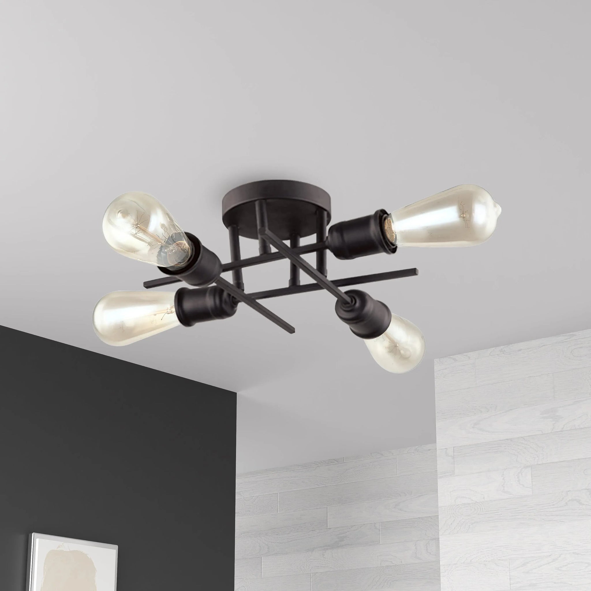 Crafted with precision metalwork and a polished chrome finish, the fixture presents four exposed sockets that showcase decorative Edison or LED filament bulbs for layered, directional illumination. The compact, flush design makes it ideal for lower ceilings, corridors, kitchens, and boutique commercial spaces where designer lighting must be both discreet and expressive.