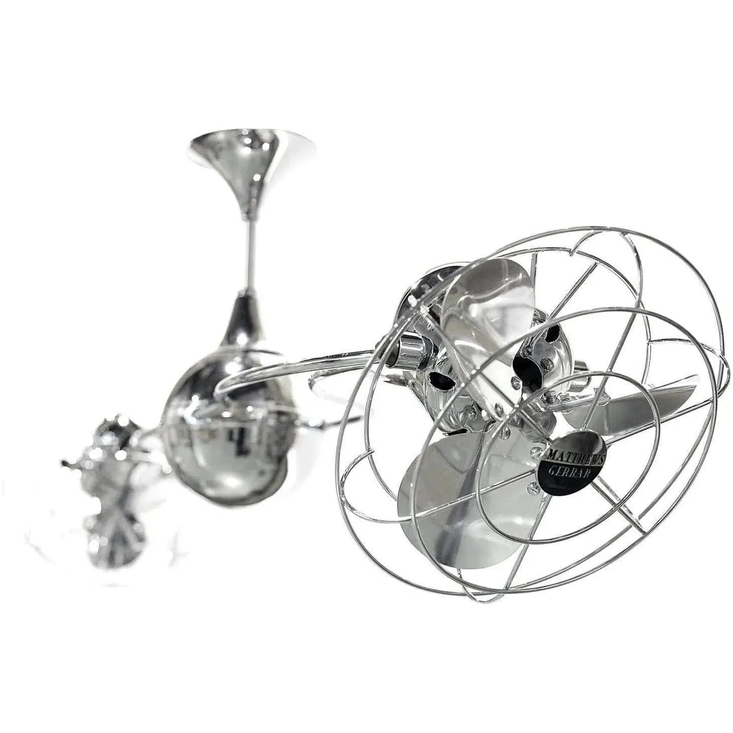 The Italo Ventania is the largest 360° rotational fan in the Matthews Fan Co collection. Its vortex sculpted arms grasp also remarkable, side-mounted fan heads in gentle, equatorial rotation. The fan heads can be infinitely positioned in 180-degree arcs for optimum air movement; the greater the angle of the motor to the horizontal support rods (up or down), the faster the axial rotation. A slow, controlled axial rotation is achieved by both fan head position and fan blade speed. Matthews 360° rotational fans circulate heat and air conditioning more efficiently than traditional paddle fans. Constructed of cast aluminum, heavy spun and stamped steel, the Ar Ruthiane carries a limited lifetime warranty.