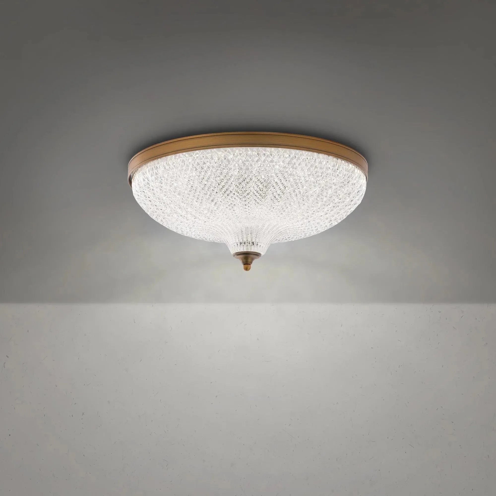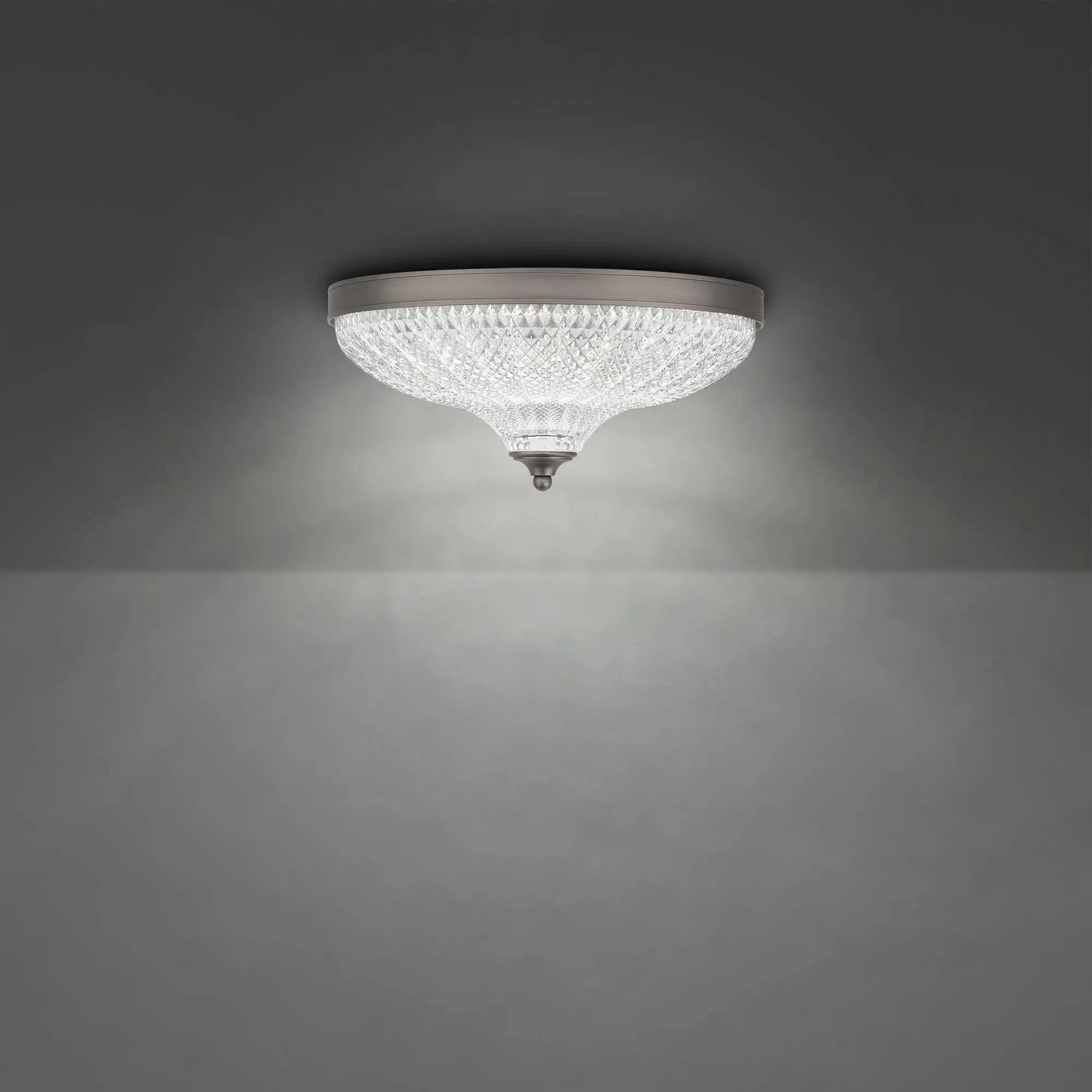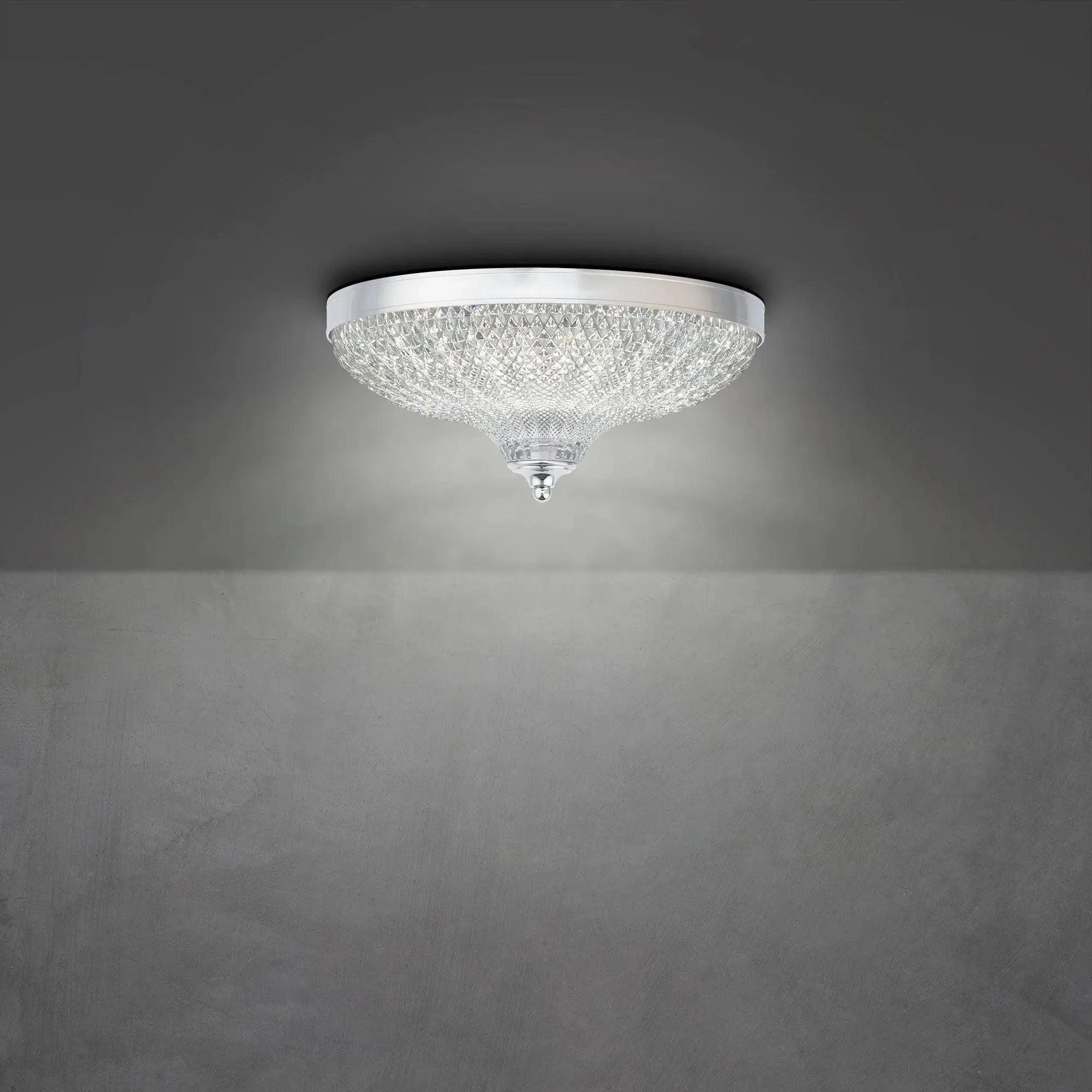 The baroque design celebrates classical Italian lighting with delicate ornamentation and artisanal crystal. An intricate hand-cut European crystal shade is combined with high quality LEDs to create a luxurious ceiling mount that is both elegant and functional for any space.