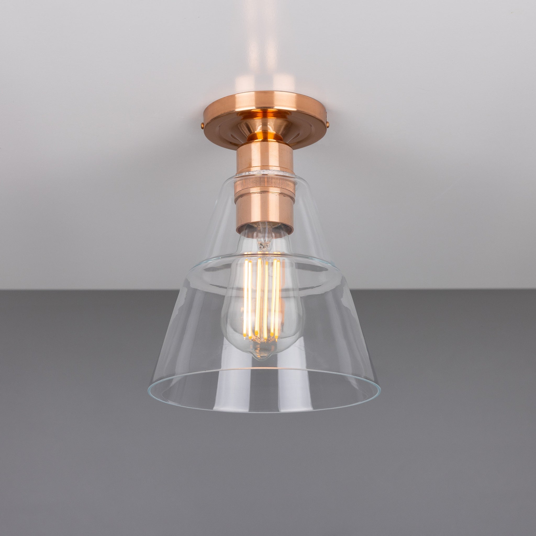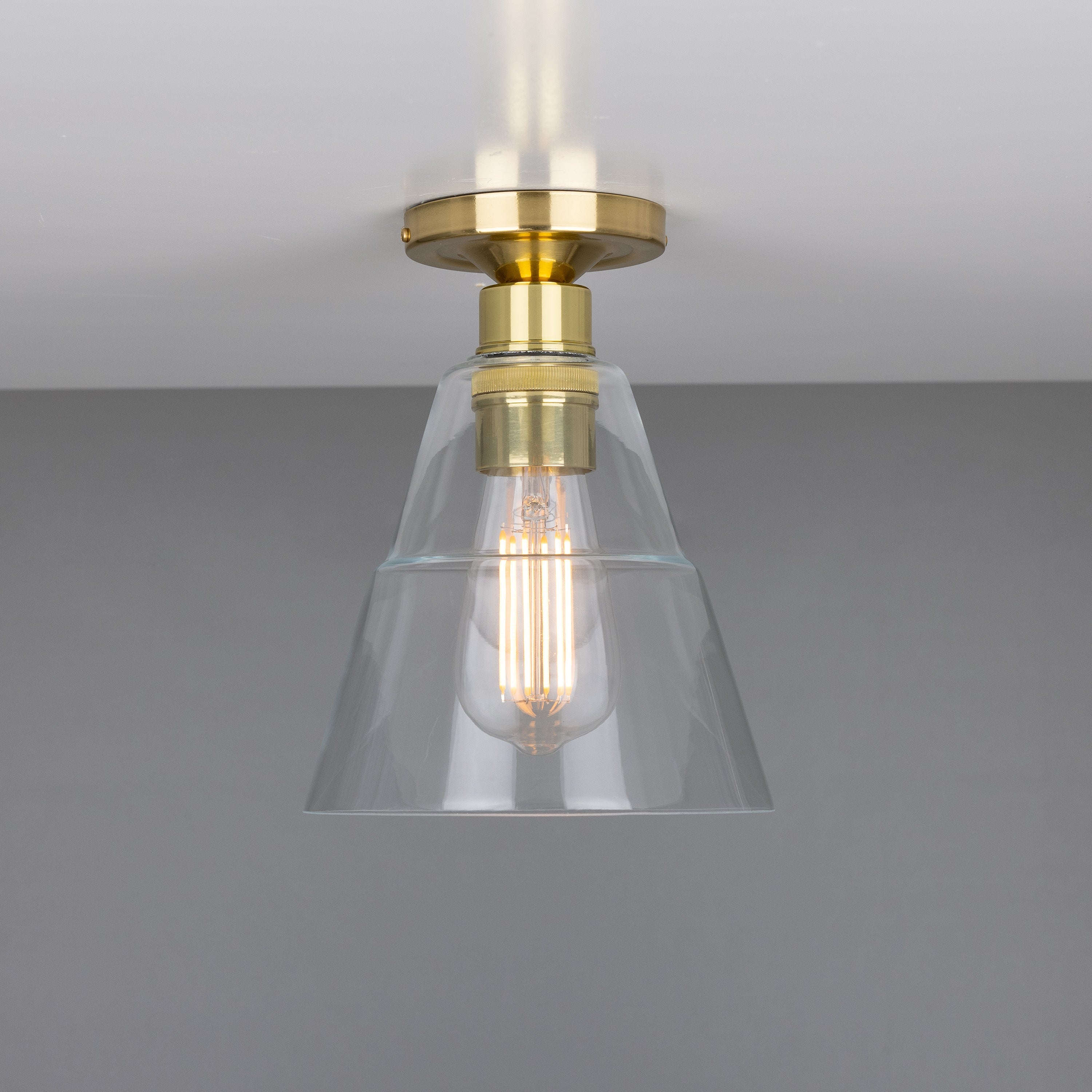 Rigale Flush Fitting — a refined ceiling light that reads as modern hardware and luxury décor in one considered piece. The clear conical glass shade and compact flush mount profile deliver a precise, architectural silhouette that highlights form and function.