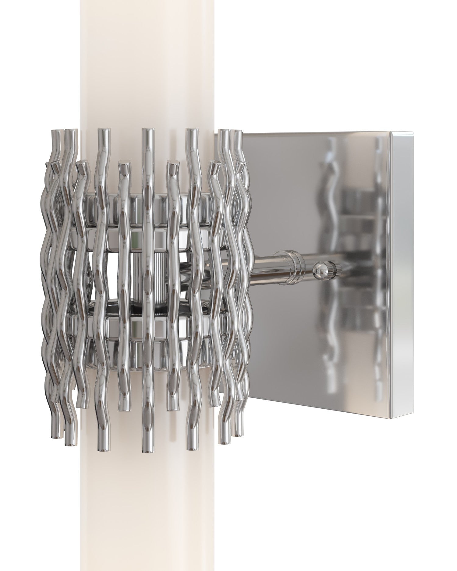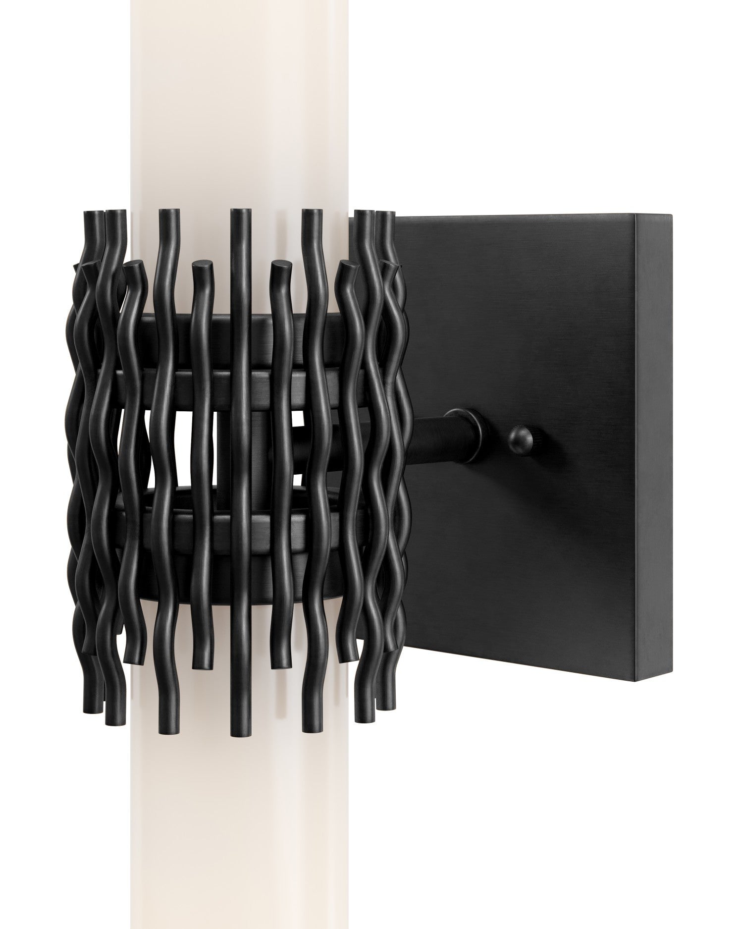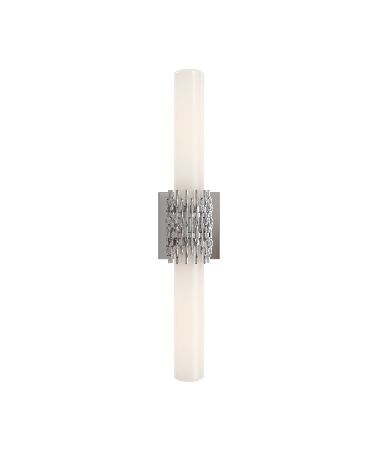 The Brietta Bath Wall Sconce is made of metal in an antique brass finish with a design that features undulating wirework that cradles two milky glass tubes, leaving an intentional negative space at the center that adds visual intrigue. Fitted with two elongated bulbs that fully illuminate the glass, a soft, ambient glow enhances the sculptural form.
