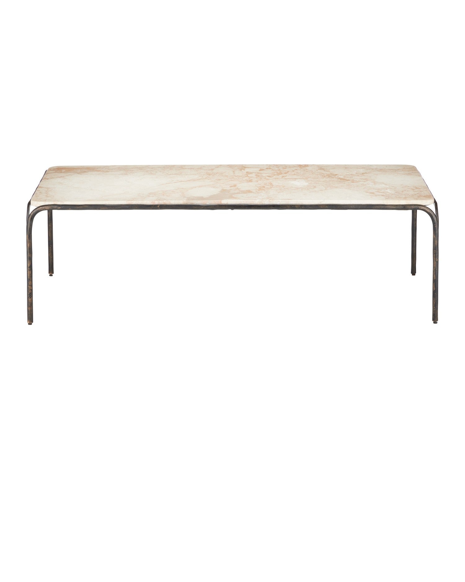 Combining industrial elegance with artisanal craftsmanship, the Crema Cocktail Table is made of metal in a warm bronze finish with a hand-forged appearance that adds depth to its streamlined silhouette. The frame folds down and away from a crema marble top at the corners to create a forked design that matches the ends of the stretchers where they meet the legs.