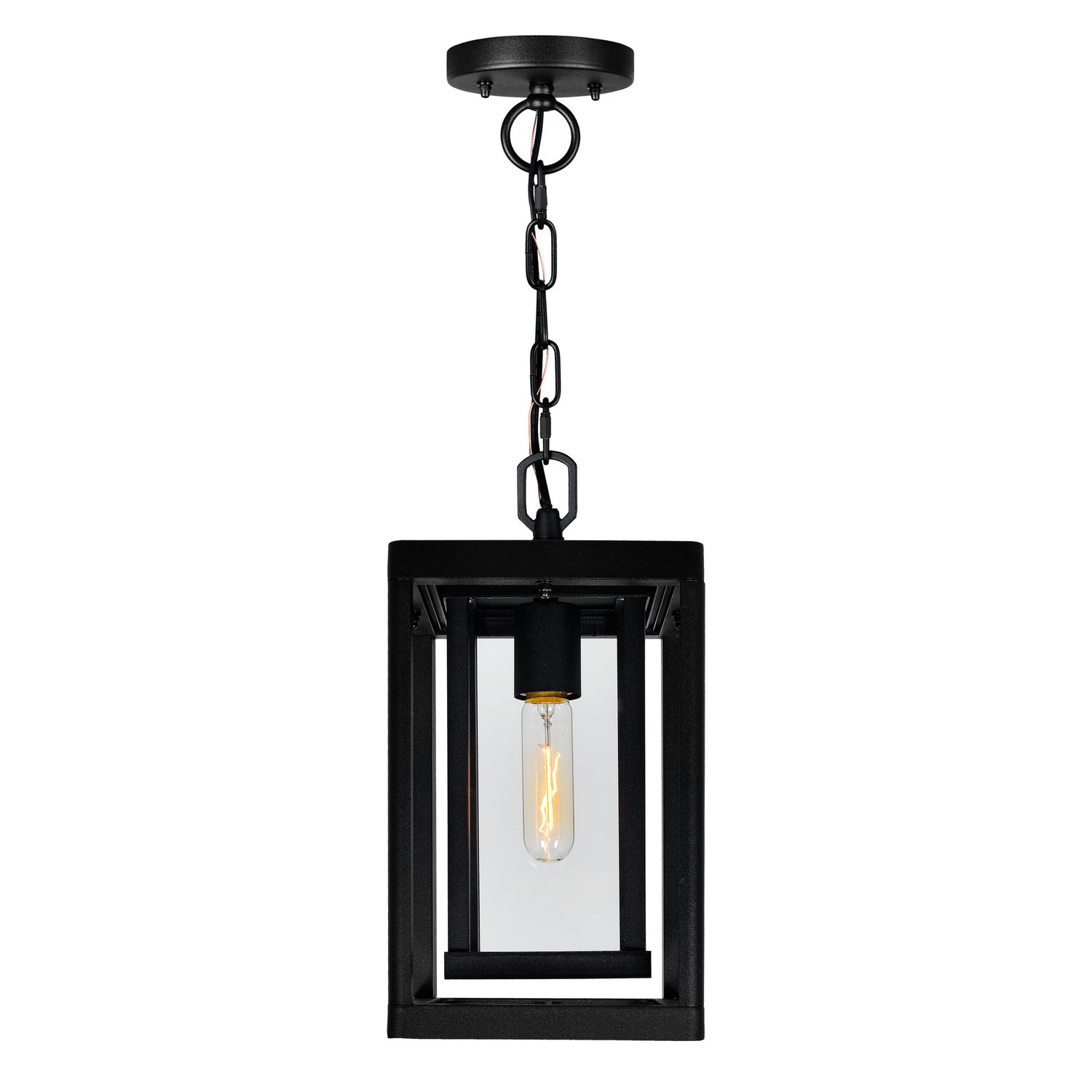 Elevate your outdoor spaces with the Mulvane 1-Light Black Outdoor Hanging Lantern. Featuring a classic rectangular design with black metal frame and clear glass sides, this fixture delivers a cozy and inviting glow. Compatible with filament bulbs, it adds drama and ambiance to patios, gardens, and walkways while offering durable, weather-resistant performance for long-lasting outdoor use.