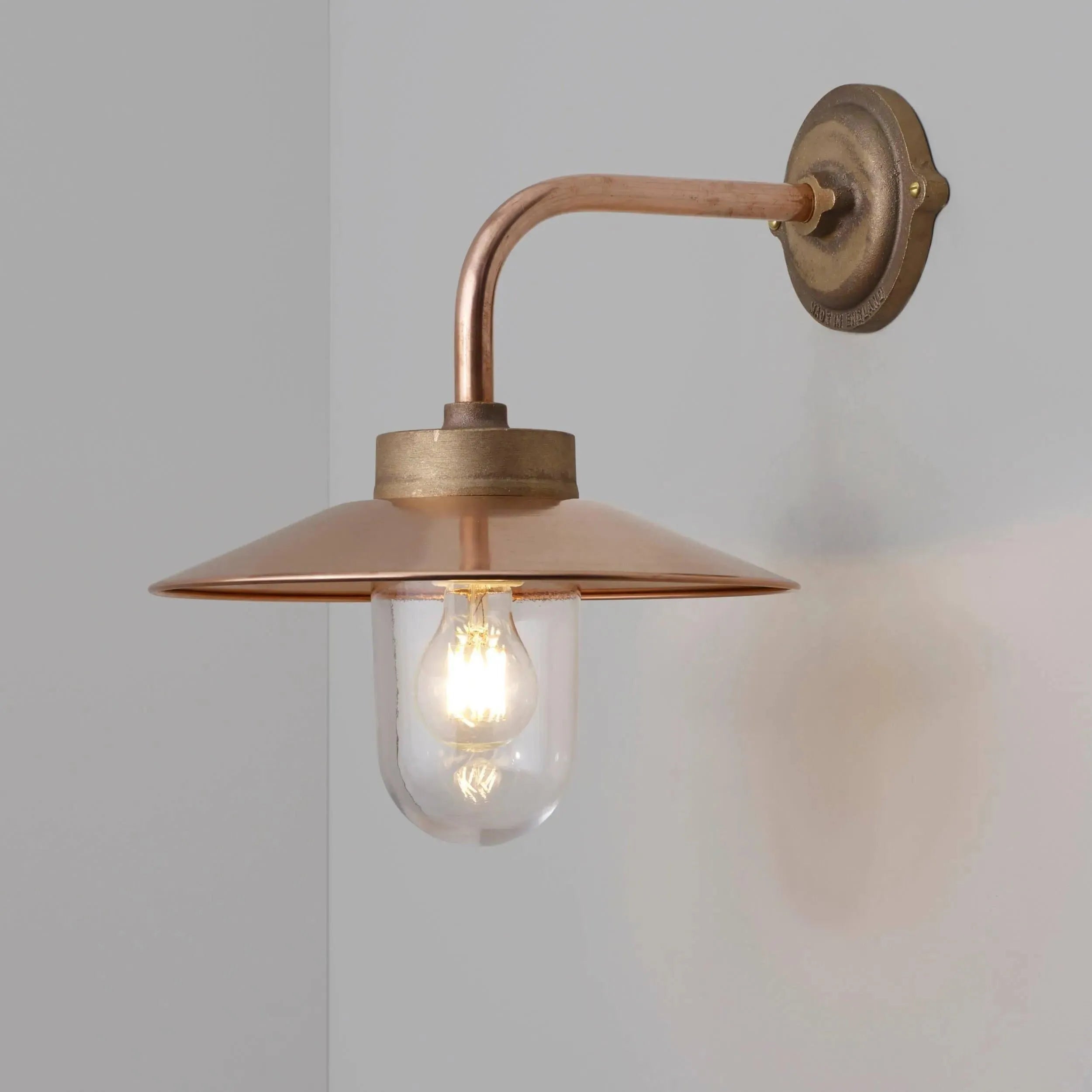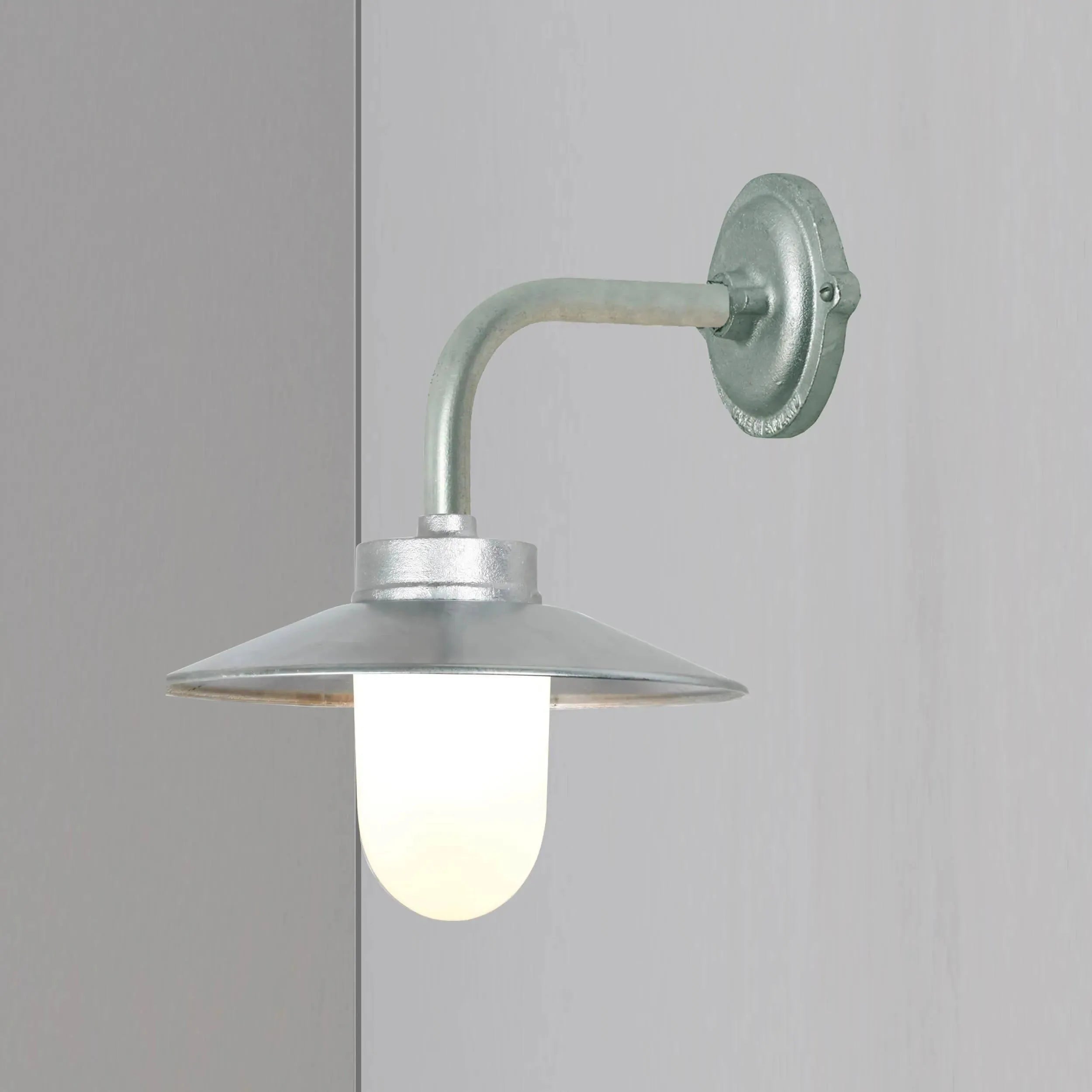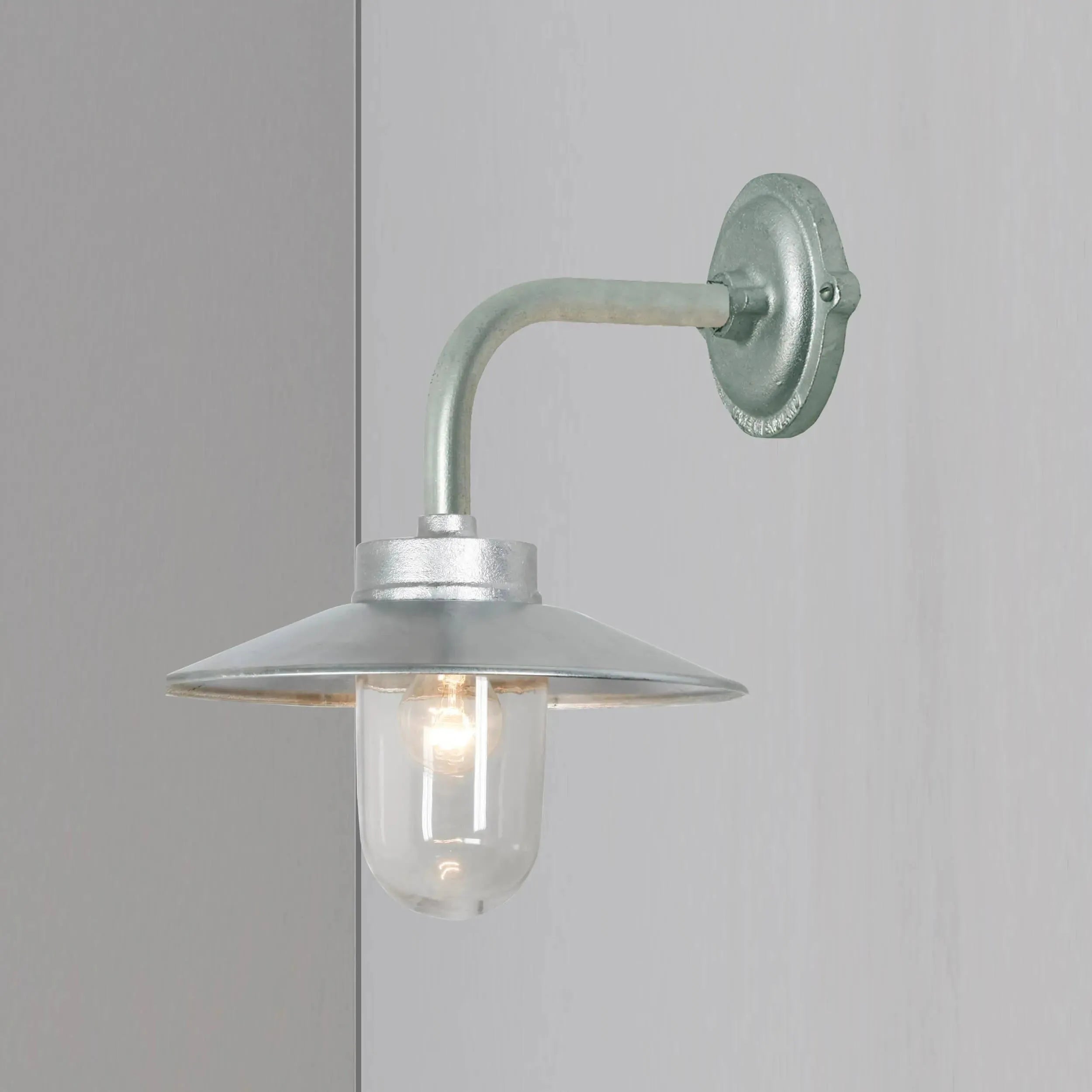 A classic, continental style well glass fitting light with screw glass. This wall light has a clean design and suits both traditional and modern locations. Crafted out of galvanised iron or raw sand blasted bronze, the light has a heavy cast construction. The wall light is available with a standard right angle arm or in the classic French canted version. Mounted either on a round base dome cover or on a corner fork.